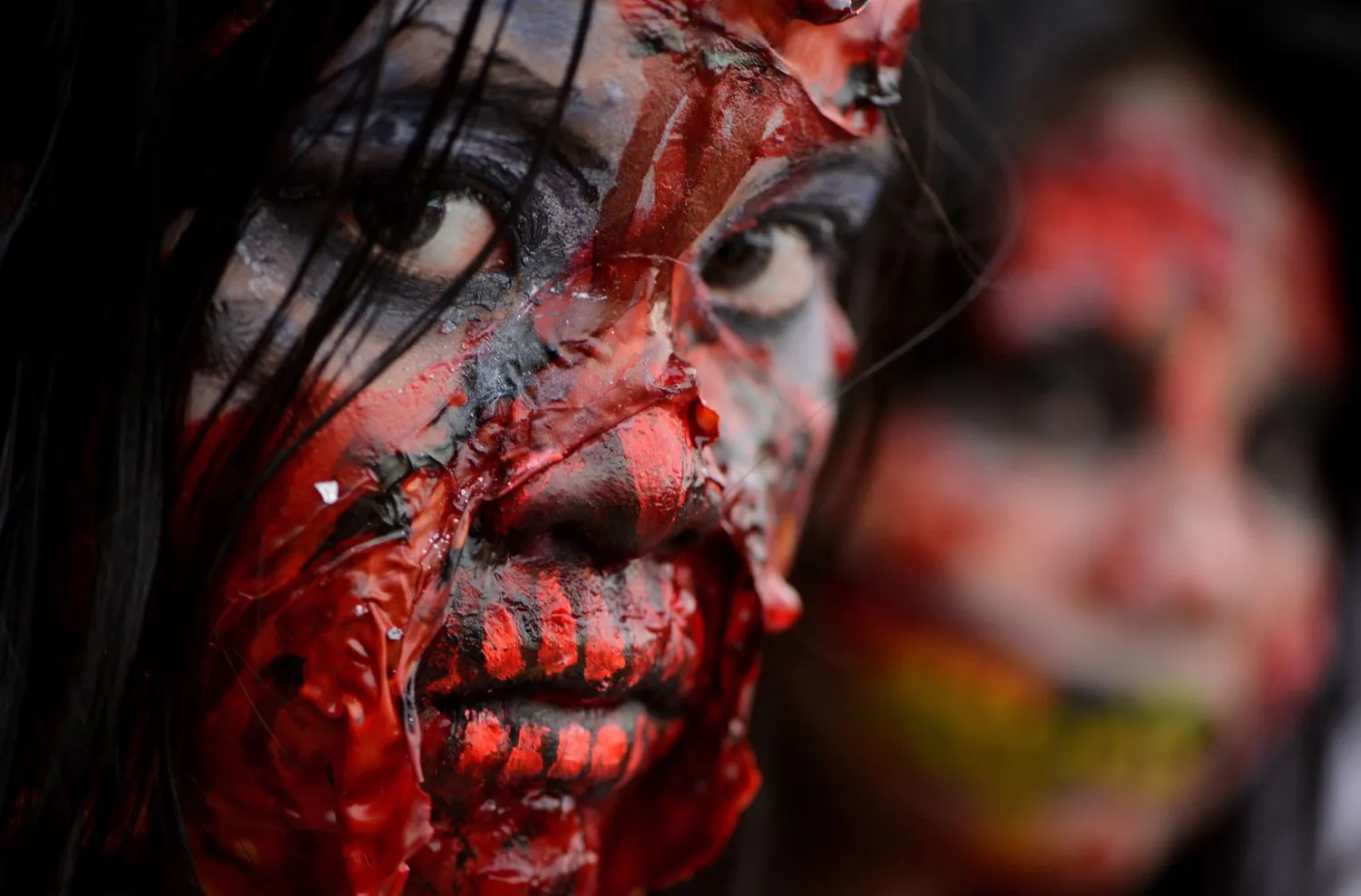 Students dressed as zombies participate in an annual Halloween Costume Parade in Manila on October 30, 2013. The activity aims to celebrate Halloween in a creative and fun way through the showcase of scary costumes. (Photo by Noel Celis/AFP Photo)