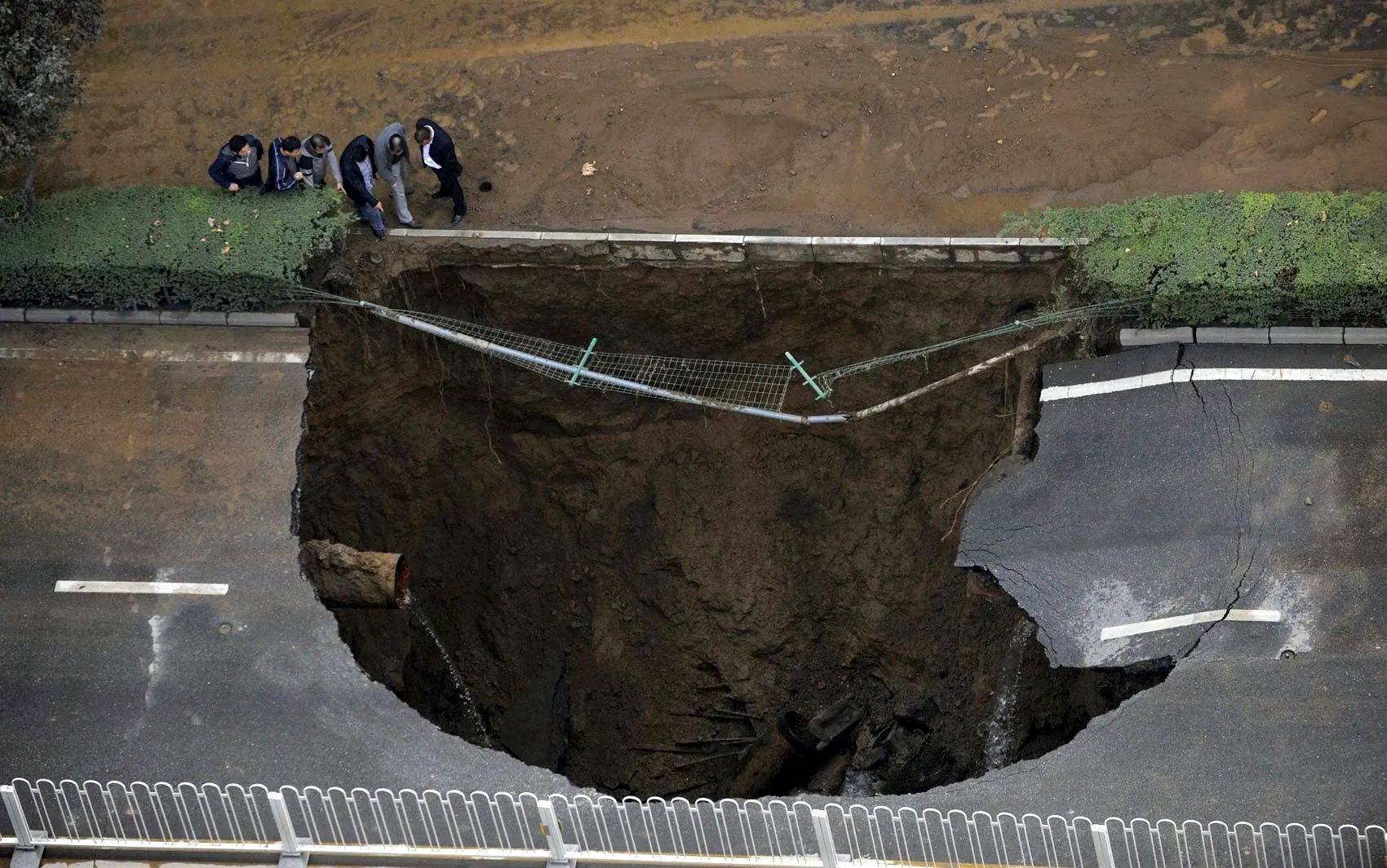 People look at a large sinkhole on a street after a water pipe broke underneath it in Xi'an, Shaanxi province, China, on October 27, 2013. (Photo by Reuters/Stringer)