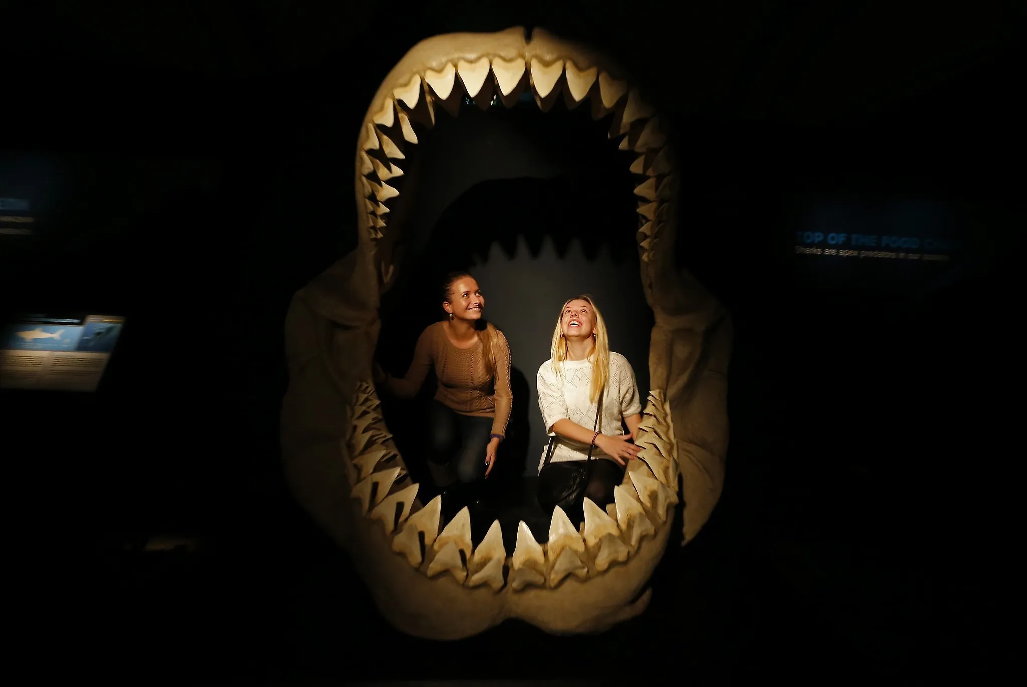 Women inspect the insides of the jaws of a megalodon, an extinct species of the shark, as they visit the international exhibition titled “Planet Shark: Predator or Prey” at the Military-Historical Museum of Artillery, Engineer and Signal Corps in St. Petersburg, October 31, 2013. The exhibition includes collections of pristine fossil specimens, jaws, hunting and commercial fishing equipment, full size casts and models of different sharks, according to organizers. (Photo by Alexander Demianchuk/Reuters)
