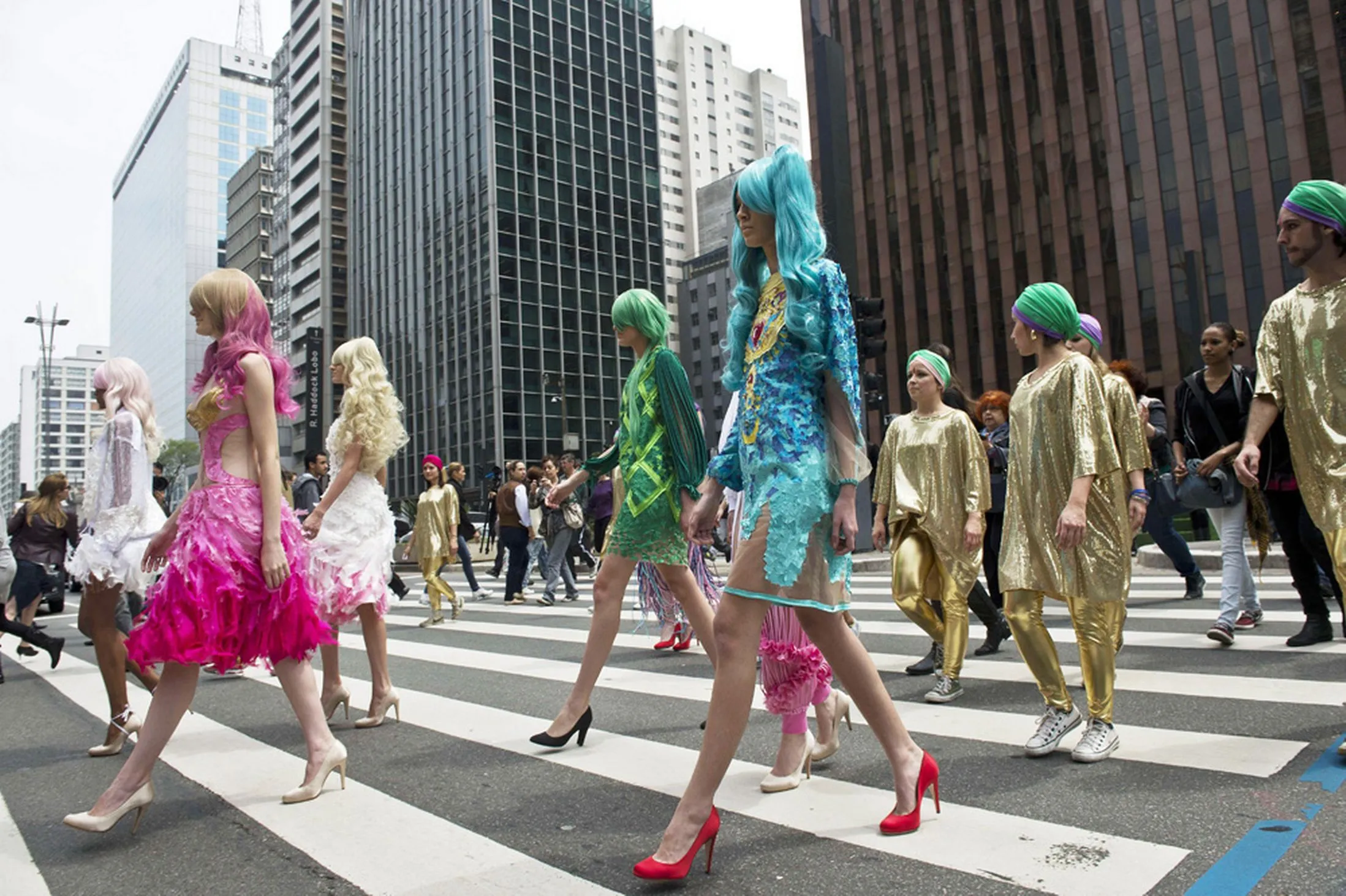 Models wear creations by FH for Fause Haten along Paulista Avenue during the presentation of the 2014 Winter collections of the Sao Paulo Fashion Week in Sao Paulo, Brazil, on Oktober 30, 2013. (Photo by Nelson Almeida/AFP Photo)