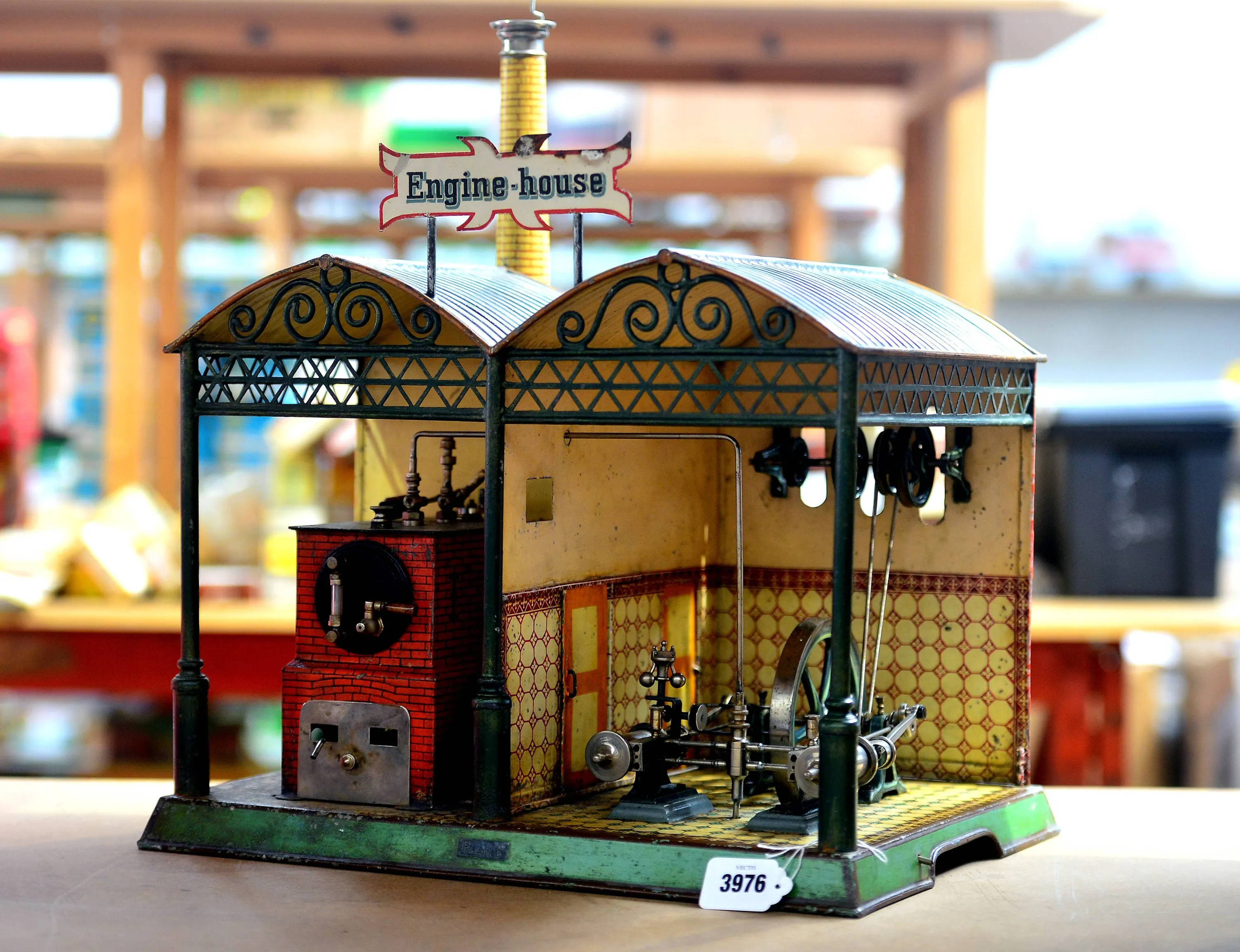 The Marklin Engine Hall at Vectis Auction House, Teesside, which is estimated to fetch £60,000-£80,000 in a Toy and Train sale at Rugby on 23rd November. Issue date: Tuesday October 29, 2013. The Marklin Engine Hall was produced in 1906 and is being auctioned by a private collector. Housed in a two room hall, each room has an individual pitched roof with ornate lattice work and girdering, with three supporting pillars and a large removable chimney to rear. Each room has faux tiling and there is a sliding door between, whilst the engine room has an opening door to the rear. The engine is connected to a line shaft with three pulleys of different sizes which could be connected to accessories outside of the Hall. (Photo by Owen Humphreys/PA Wire)