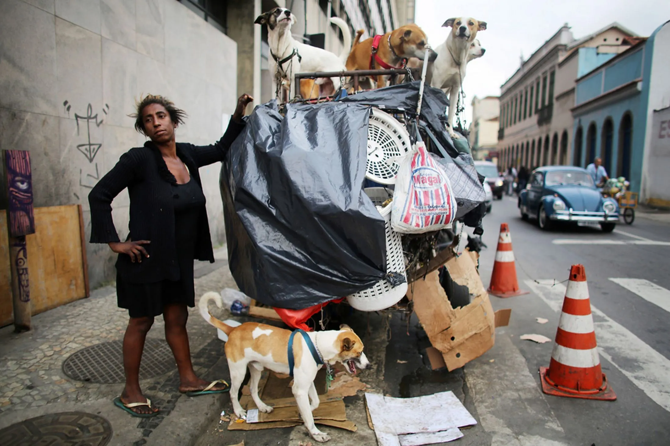 Rosana Moses stands with the family of 16 dogs she cares for in Rio de Janeiro, Brazil. She lives on the streets and relies on donations to help care for the dogs, on Oktober 30, 2013. (Photo by Mario Tama/Getty Images)