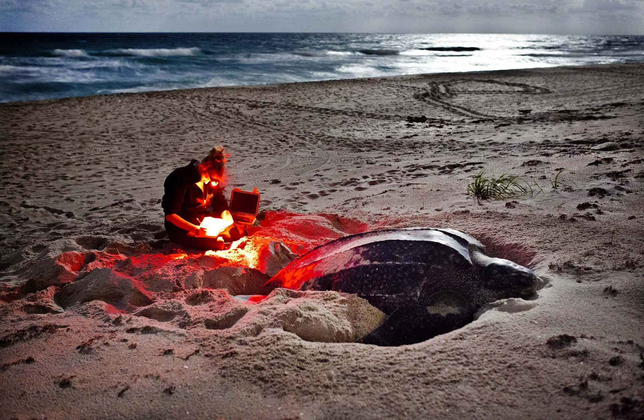Biologist Kelly Martin records her measurements of Electra, a 5 1/2 foot leatherback turtle nesting on the beach behind the Seminole Golf Club course in Juno Beach. Martin uses a red light which is invisible to turtles. (Photo by Greg Lovett/The Palm Beach Post)