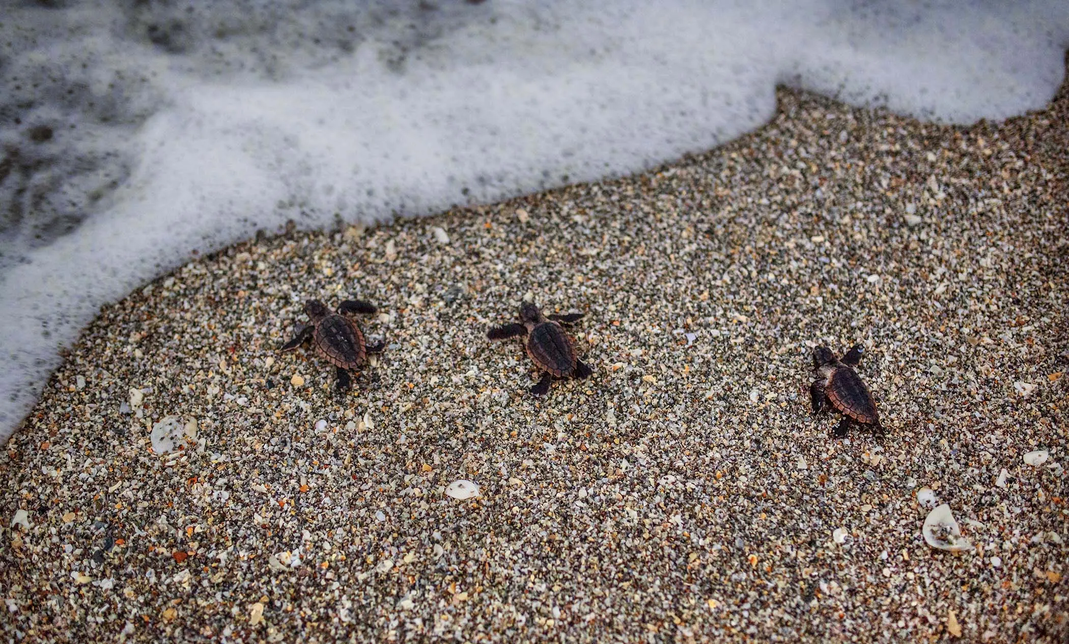 Three loggerhead hatchlings crawl to the surf after emerging from their nest in Coral Cove Park. (Photo by Greg Lovett/The Palm Beach Post)