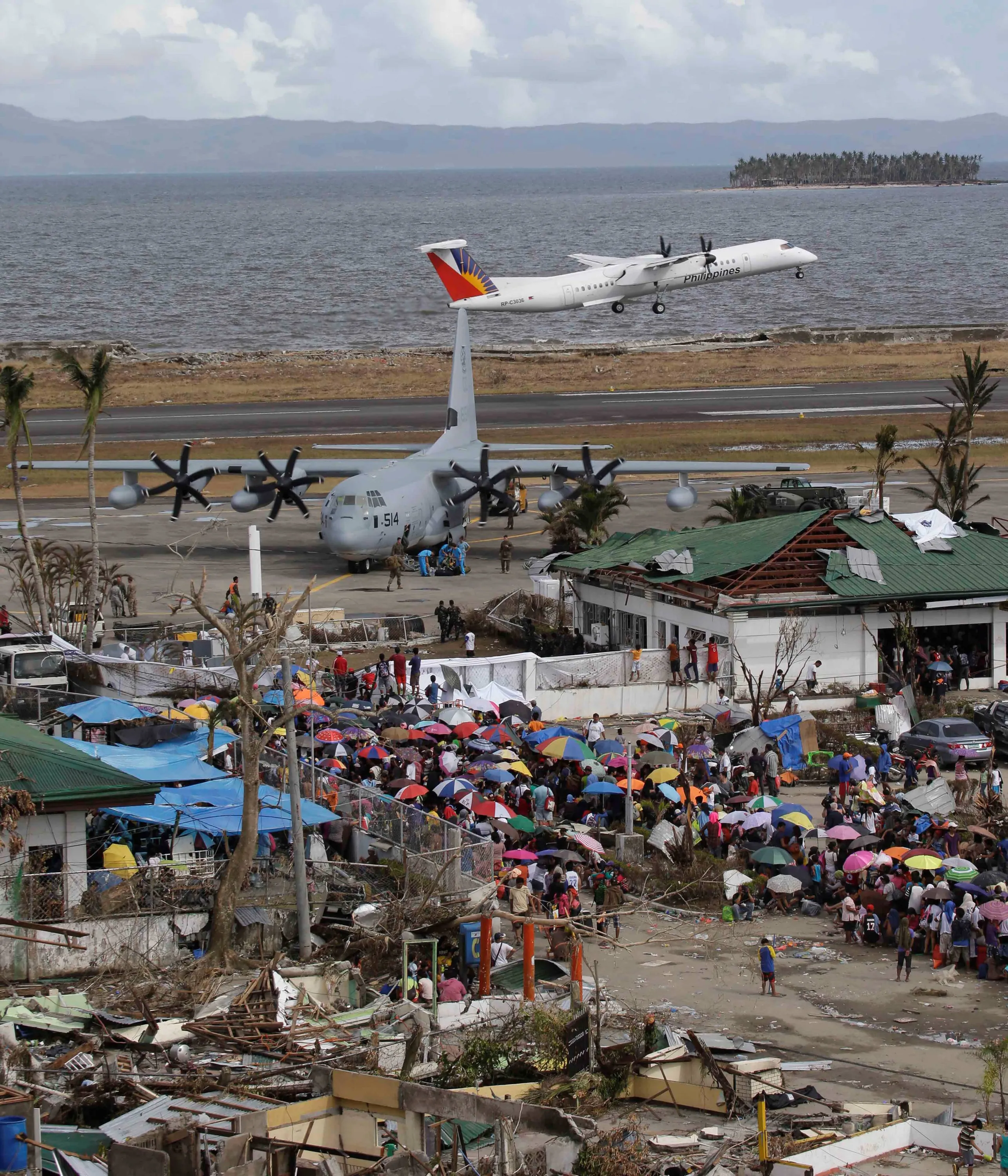 A Philippine Airlines passenger plane takes off as typhoon survivors in lines take their chance to board U.S. military transport planes from the damaged airport in Tacloban city, Leyte province in central Philippines, Wednesday November 13, 2013. (Photo by Bullit Marquez/AP Photo)