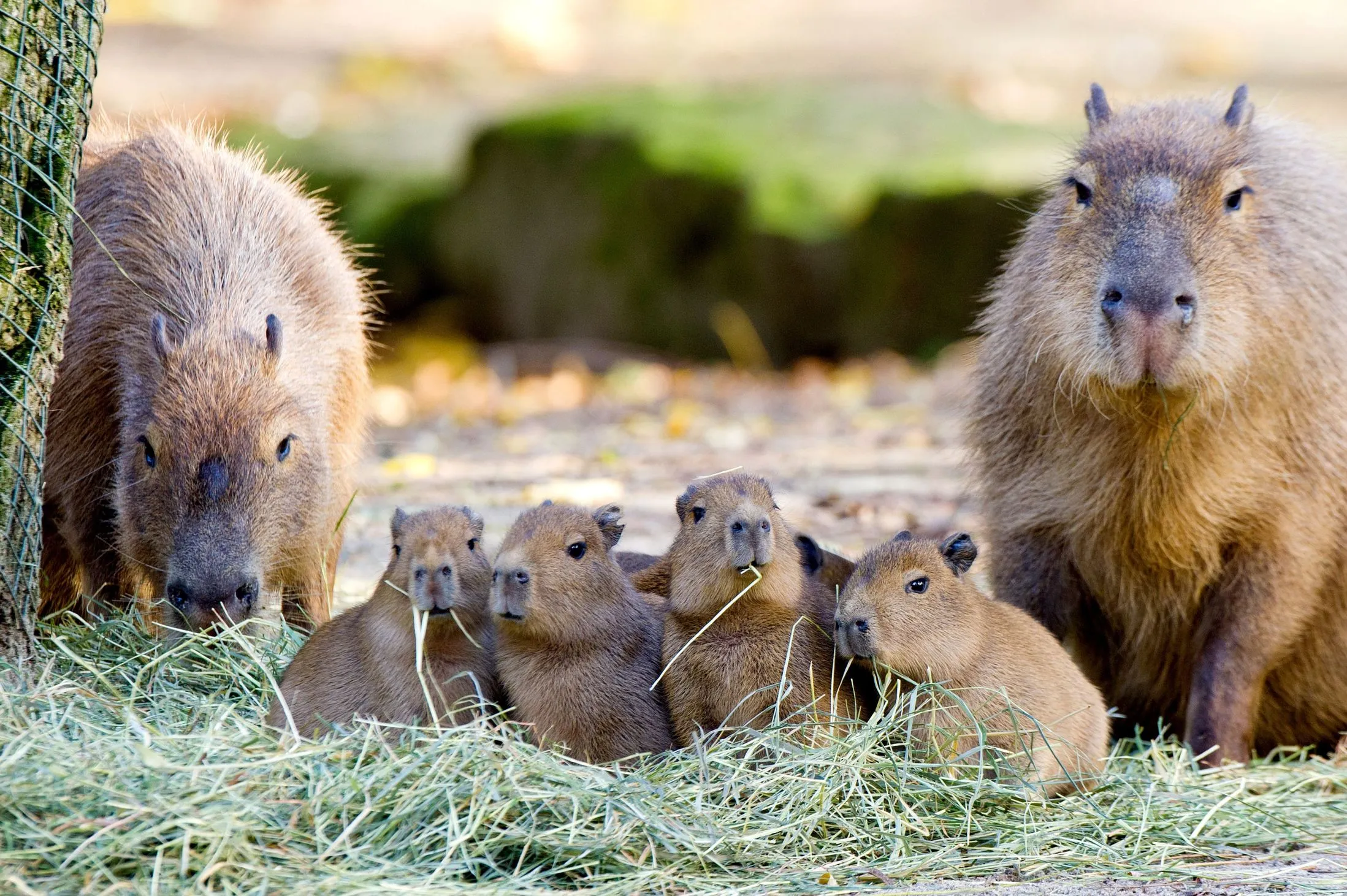 Four young capybaras are flanked by their parents in their enclosure at the Hannover Zoo (Niedersachsen), on November 13, 2013. (Photo by Christoph Schmidt/AP Images/DPA)