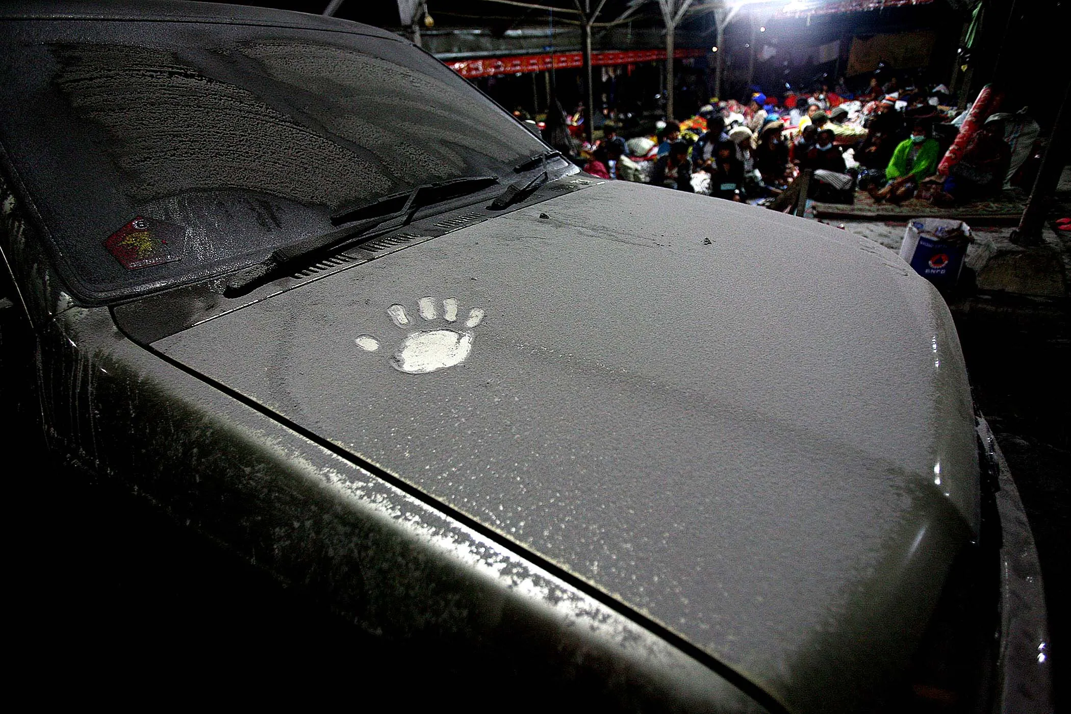 A hand print is seen on the hood of a car covered with volcanic ash from the eruption of Mount Sinabung, in Tiga Nderket village on November 4, 2013. (Photo by Binsar Bakkara/Associated Press)