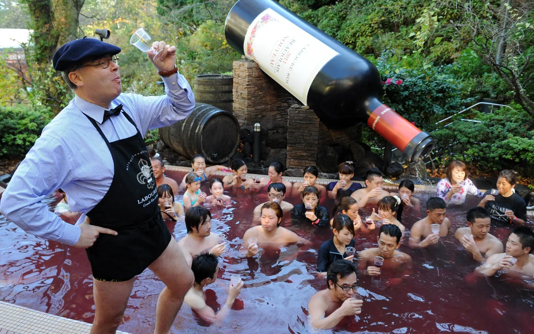 Bourgogne wine maker Laboure-Roi vice president Thibault Garin (L) toasts the company's 2013 Beaujolais Nouveau wine with guests in the wine spa at the Hakone Yunessun spa resort facilities in Hakone town, Kanagawa prefecture, some 100-kilometre west of Tokyo on November 21, 2013. As the new vintage Beaujolais Nouveau is officially uncorked, Hakone Yunessun started the annual 10-day-long Beaujolais Nouveau spa event with a guest of the wine maker's executive. (Photo by Toshifumi Kitamura/AFP Photo)