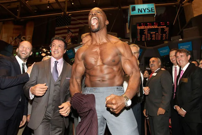 The cast of The Expendables, L-R: actors Jason Statham, Sylvester Stallone, Dolph Lundgren and Terry Crews attended the ringing of the opening bell at the New York Stock Exchange on Wall Street in NYC today. There is something so unsexy (not to mention suspect) about a male who constantly takes off his shirt to flex his muscles while in the company of other alpha males.