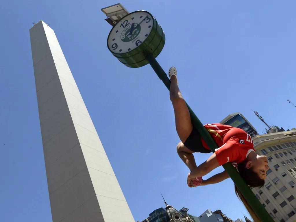 A Chilean participant in the Miss Pole Dance South America 2013 competition performs in in front of the obelisk in Republica Square in downtown Buenos Aires on November 22, 2013 ahead of the contest to be held on November 23 and 25 in the city. (Photo by Juan Mabromata/AFP Photo)