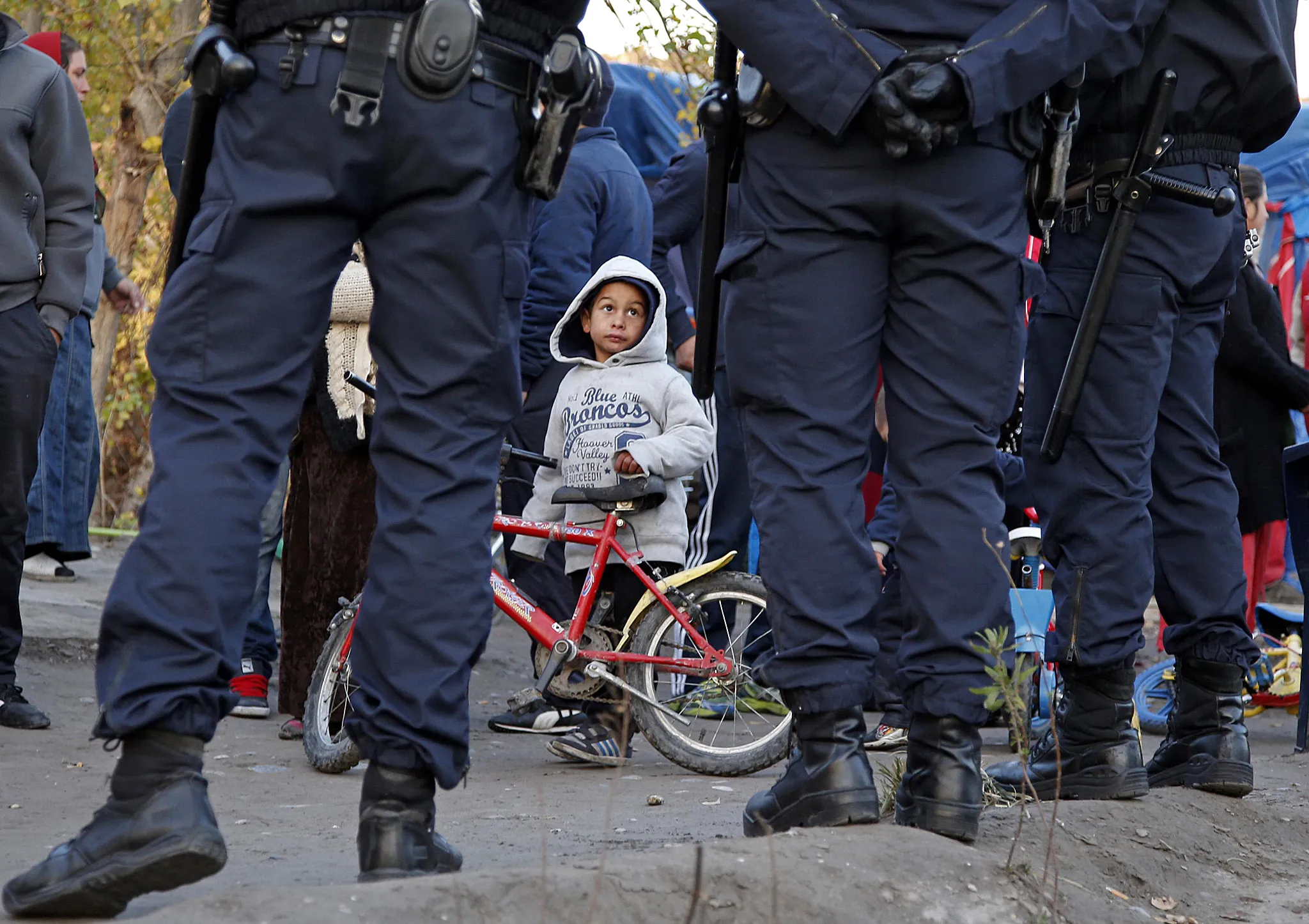 A Roma child looks at French police standing guard as Roma families are evacuated from their illegal camp near the Var river in Nice, southeastern France, November 27, 2013. (Photo by Eric Gaillard/Reuters)