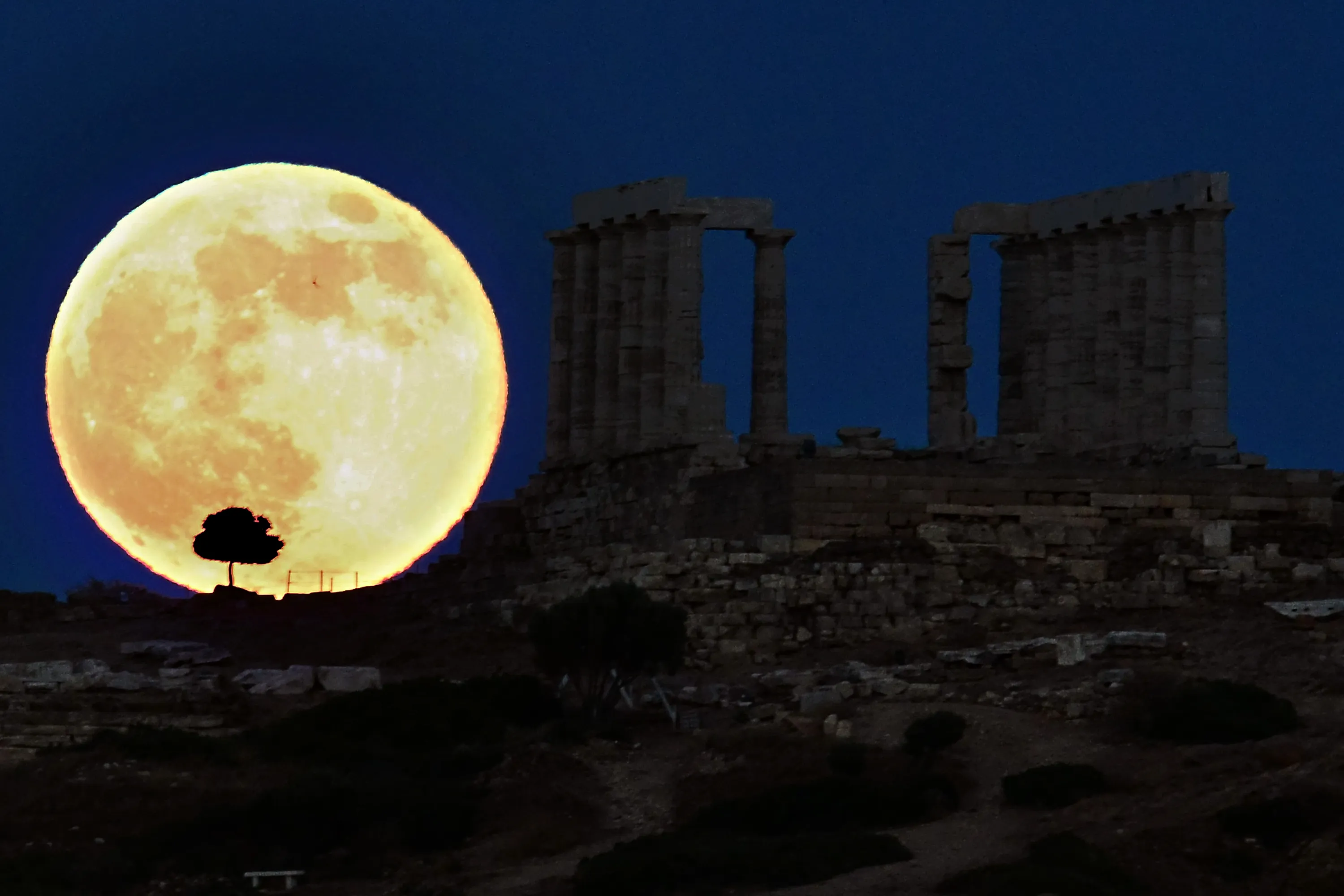 A supermoon rises next to the ancient Greek temple of Poseidon at Cape Sounion, some 65 kilometers south of Athens, on June 23, 2013. (Photo by Aris Messinis/AFP Photo)