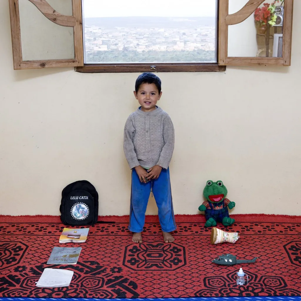 Norden – Massa, Marocco. Norden lives in Massa, a small village 40km south of Agadir. In the room where he plays and sleeps there is nothing, except for a carpet. Every day he wakes up early together with his family and he goes with the down to the valley where they have some pieces of land to farm. He spends most of his time playing with a small dog outside, even because the ones in the photo are all the toys he owns. “Toy Stories” project. (Photo and caption by Gabriele Galimberti)