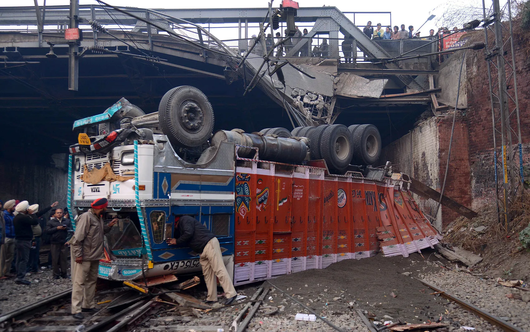 Indian Punjab police personnel inspect an upturned truck, overloaded with sand, which landed on the railway tracks when the oldest bridge on which it was travelling collapsed, in Amritsar on December 6, 2013. No injury or casualty was reported and all trains were delayed for three hours due to this mishap. (Photo by Narinder Nanu/AFP Photo)