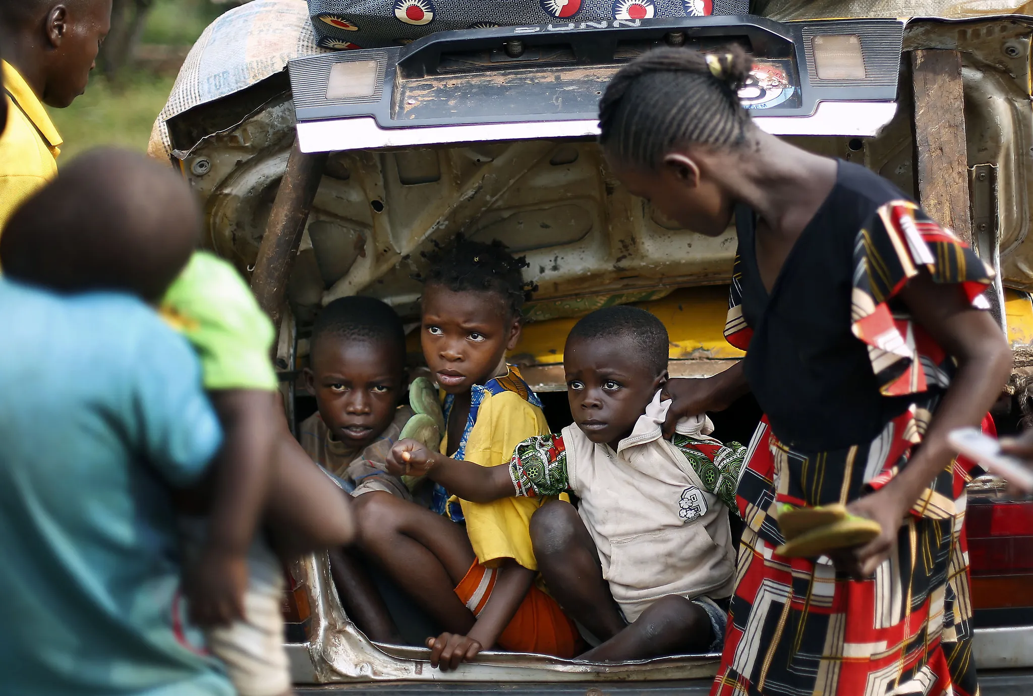 Christian children from the village of Bouebou, some 40 kms (30 miles) North of Bangui, Central African Republic, are packed in the trunk of a taxi to flee sectarian violence Wednesday December 4, 2013. Over 500 villagers have fled towards the capital Bangui fearing repression from Seleka fighters following the killing of Muslim residents by the Anti-Balaka militias Monday Dec. 2 nearby. The UN security council is scheduled to pass a motion allowing French troops to deploy in the country in order to protect civilians and insure security by all necessary means. (Photo by Jerome Delay/AP Photo)