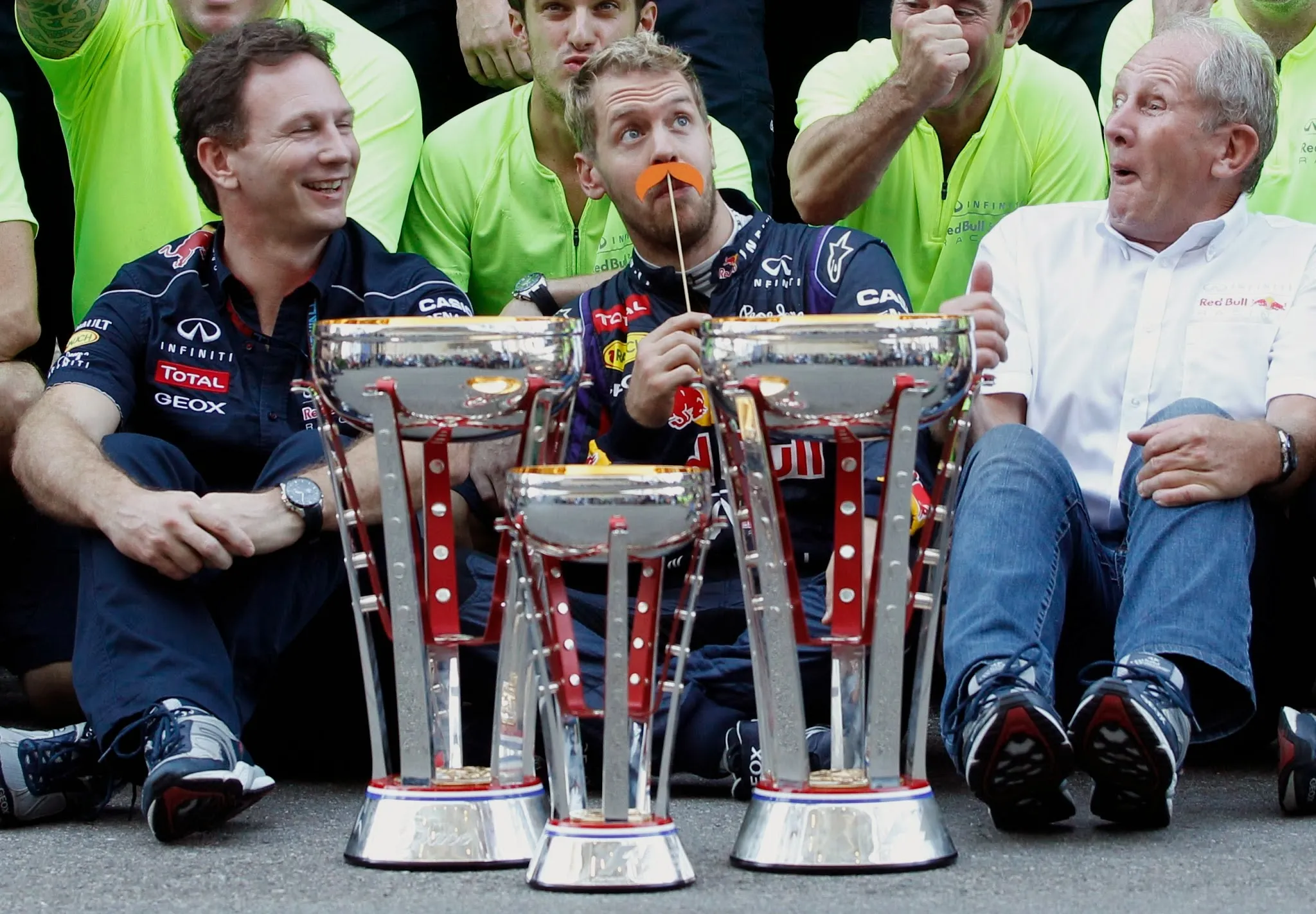 Red Bull Formula One driver Sebastian Vettel of Germany (C) jokes as he celebrates his win with the Red Bull team after the Austin F1 Grand Prix at the Circuit of the Americas in Austin November 17, 2013. (Photo by Mike Stone/Reuters)