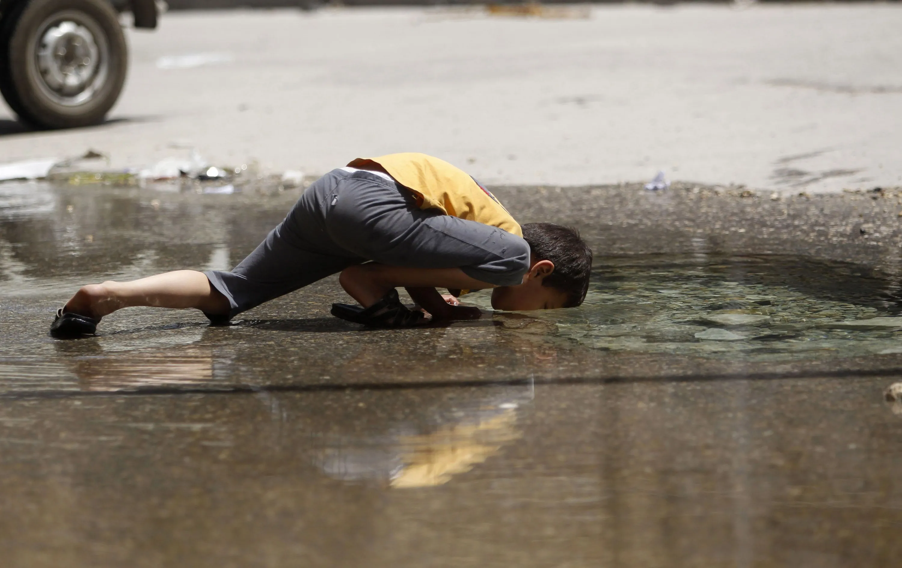 A boy drinks water from a burst water pipe in Aleppo's Karm al-Jabal district, June 2, 2013. (Photo by Muzaffar Salman/Reuters)
