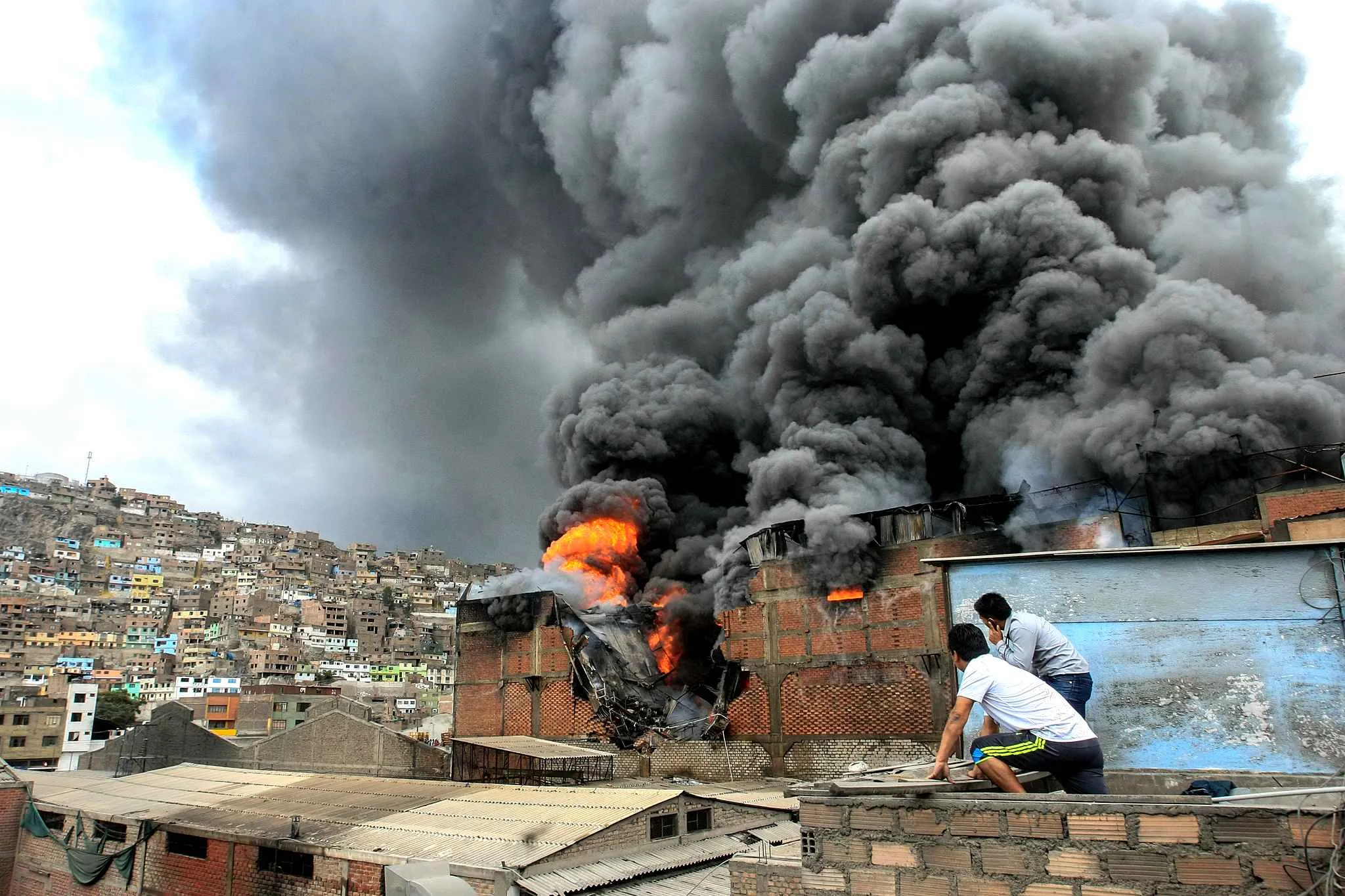 People observe as a fire ravages through a tire wharehouse in downtown Lima on December 10, 2013. The toxic smoke from the tires left at least 2 firefighters and 14 civilians injured. (Photo by AFP Photo/STR)