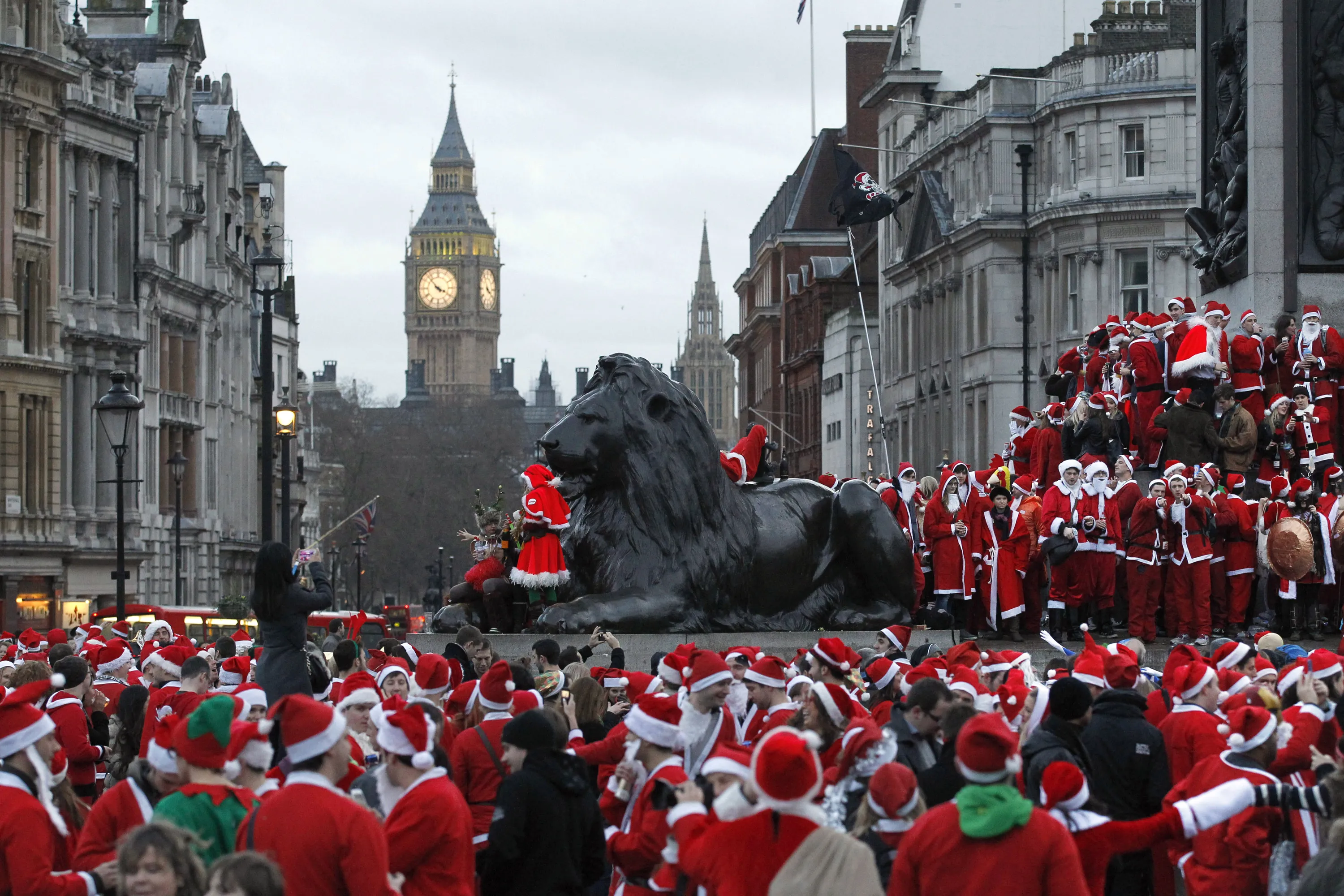 In this December 15, 2012 file photo, revellers dressed up in Santa gather at Trafalgar Square in London during a SantaCon festival in London. SantaCon events unfold in more than 300 cities worldwide and the New York celebration is one of the biggest, but complaints about boorish, bar-hopping St. Nicks at previous SantaCons got attention from local officials and the NYPD. (Photo by Sang Tan/AP Photo)
