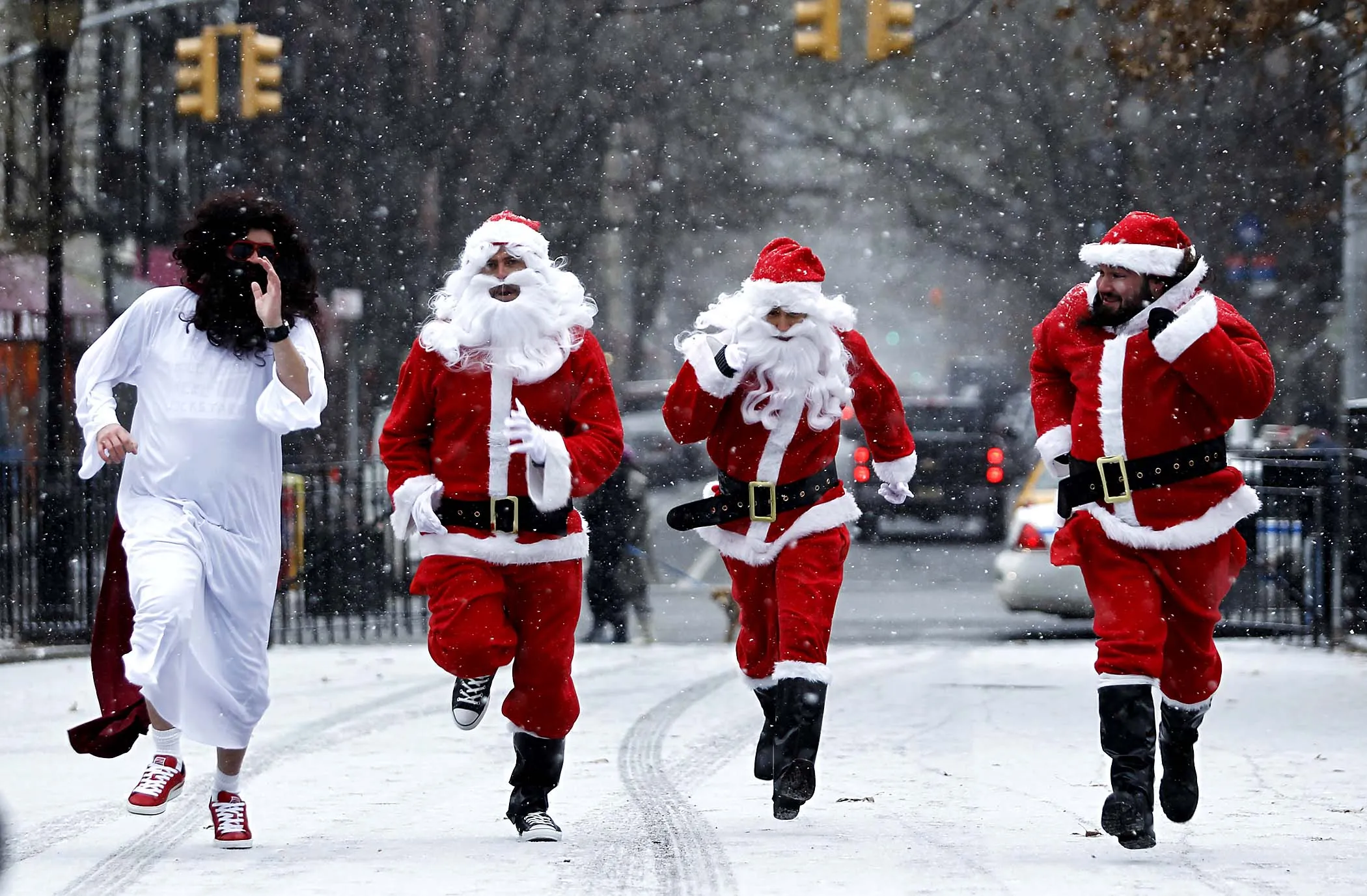 Revelers dressed as Santa Claus run as they arrive at Tompkins Square Park to take part in the annual SantaCon bar crawl in New York City. (Photo by Kena Betancur/Getty Images)