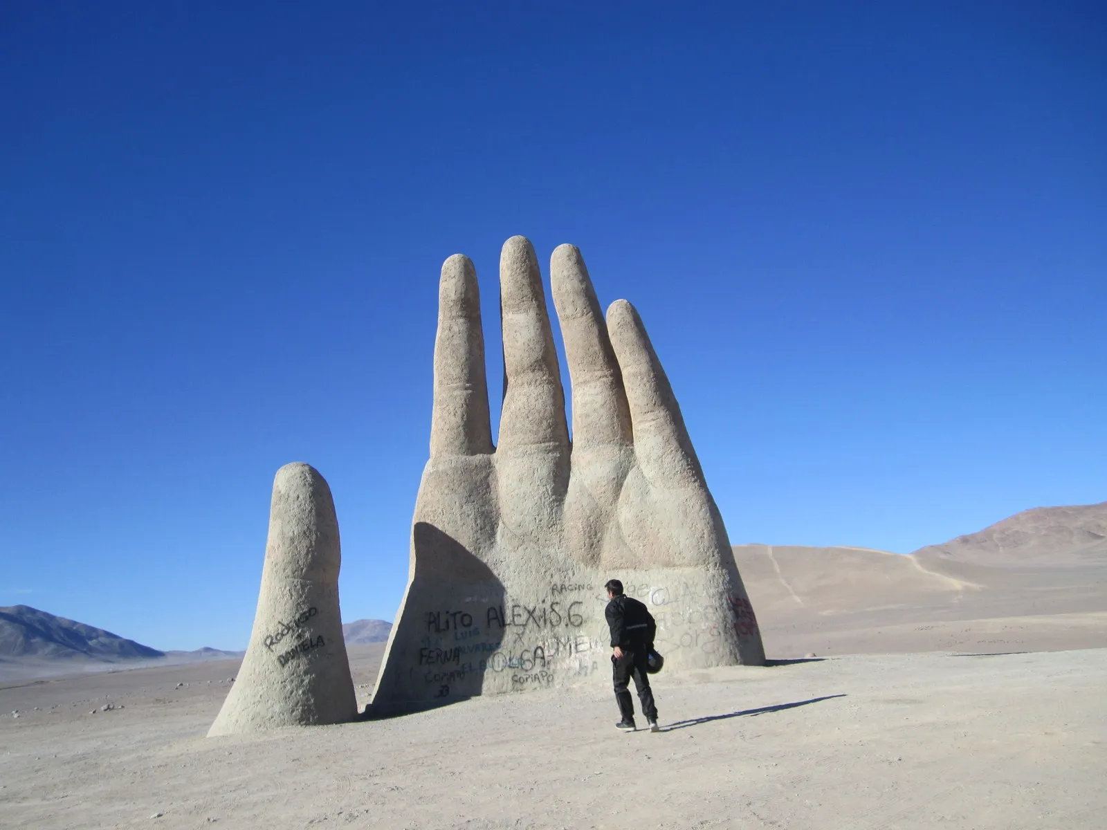 The Mano de Desierto is a large-scale sculpture of a hand located in the Atacama Desert in Chile, 75 km to the south of the city of Antofagasta, on the Panamerican Highway. The nearest point of reference is the “Ciudad Empresarial La Negra” (La Negra Business City). The sculpture was constructed by the Chilean sculptor Mario Irarrázabal at an altitude of 1,100 meters above sea level. Irarrázabal used the human figure to express emotions like injustice, loneliness, sorrow and torture. Its exaggerated size is said to emphasize human vulnerability and helplessness. The work has a base of iron and cement, and stands 11 metres (36 ft) tall. Funded by Corporación Pro Antofagasta, a local booster organization, the sculpture was inaugurated on March 28, 1992.