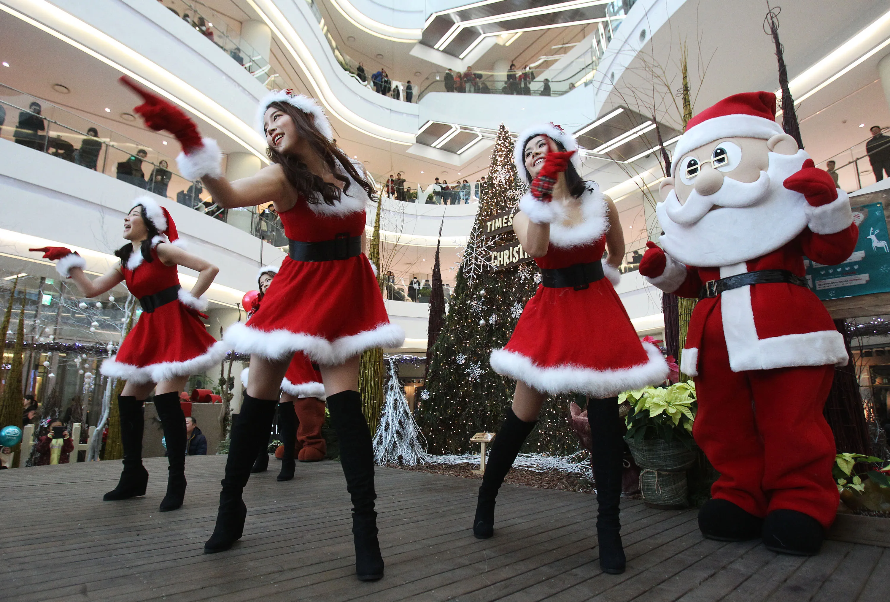 Employees dressed as Santa Claus perform as part of a shopping mall's Christmas celebrations in Seoul, South Korea, Tuesday, December 24, 2013. (Photo by Ahn Young-joon/AP Photo)