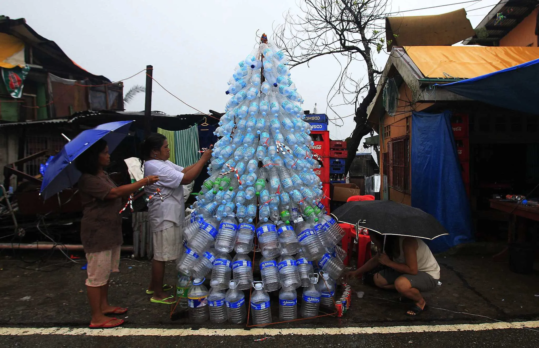 Victims of super Typhoon Haiyan decorate their improvised Christmas tree with empty cans and bottles at the ravaged town of Anibong, Tacloban city, central Philippines December 24, 2013, a month after Typhoon Haiyan battered central Philippines. (Photo by Romeo Ranoco/Reuters)