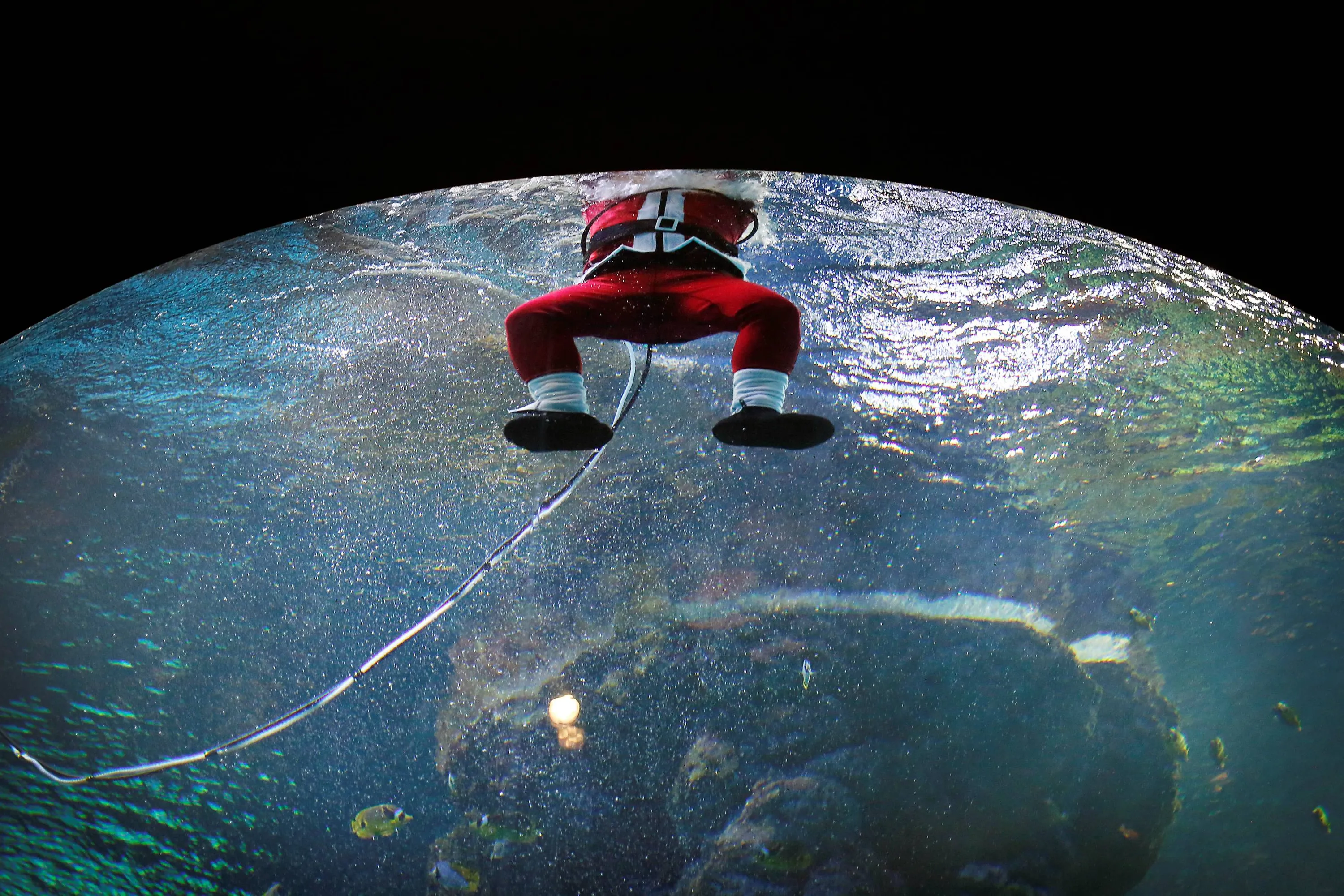 A diver dressed as Santa Claus surfaces after swimming in the Coral Garden tank, Tuesday, December 24, 2013 at the South East Asia Aquarium of Resorts World Sentosa, a popular tourist attraction in Singapore. This is part of the attraction's Christmas celebrations. (Photo by Wong Maye-E/AP Photo)