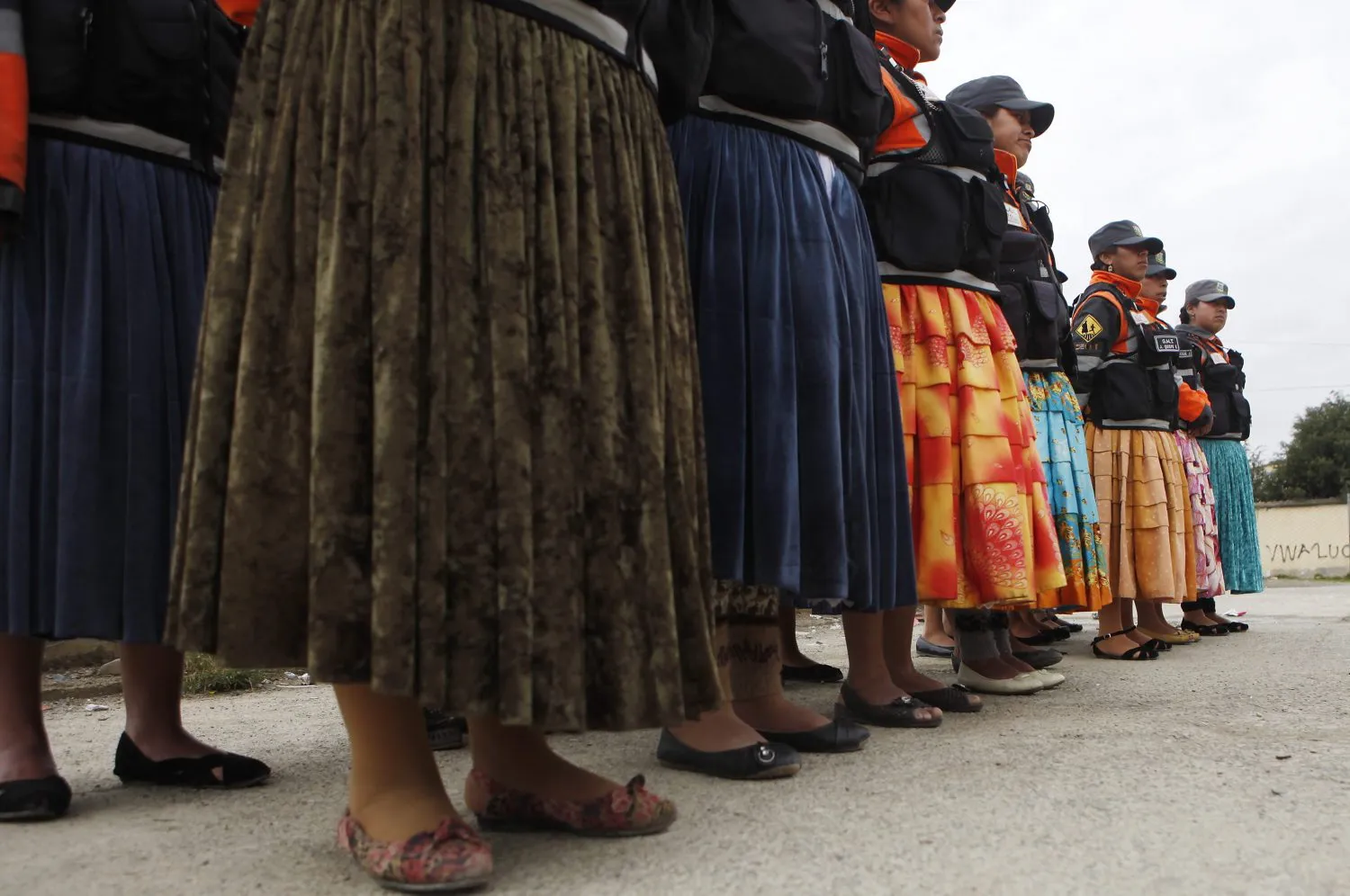 In this December 13, 2013, so-called “traffic cholitas” stand in formation before heading out to the streets to control and direct traffic in El Alto, Bolivia. (Photo by Juan Karita/AP Photo)