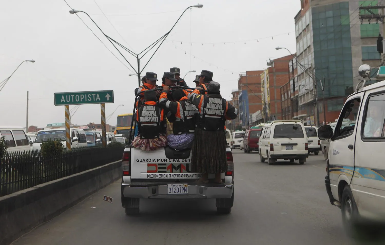 In this December 13, 2013 photo, Aymara traffic policewomen are transported to a checkpoint to help control and direct traffic in El Alto, Bolivia. (Photo by Juan Karita/AP Photo)