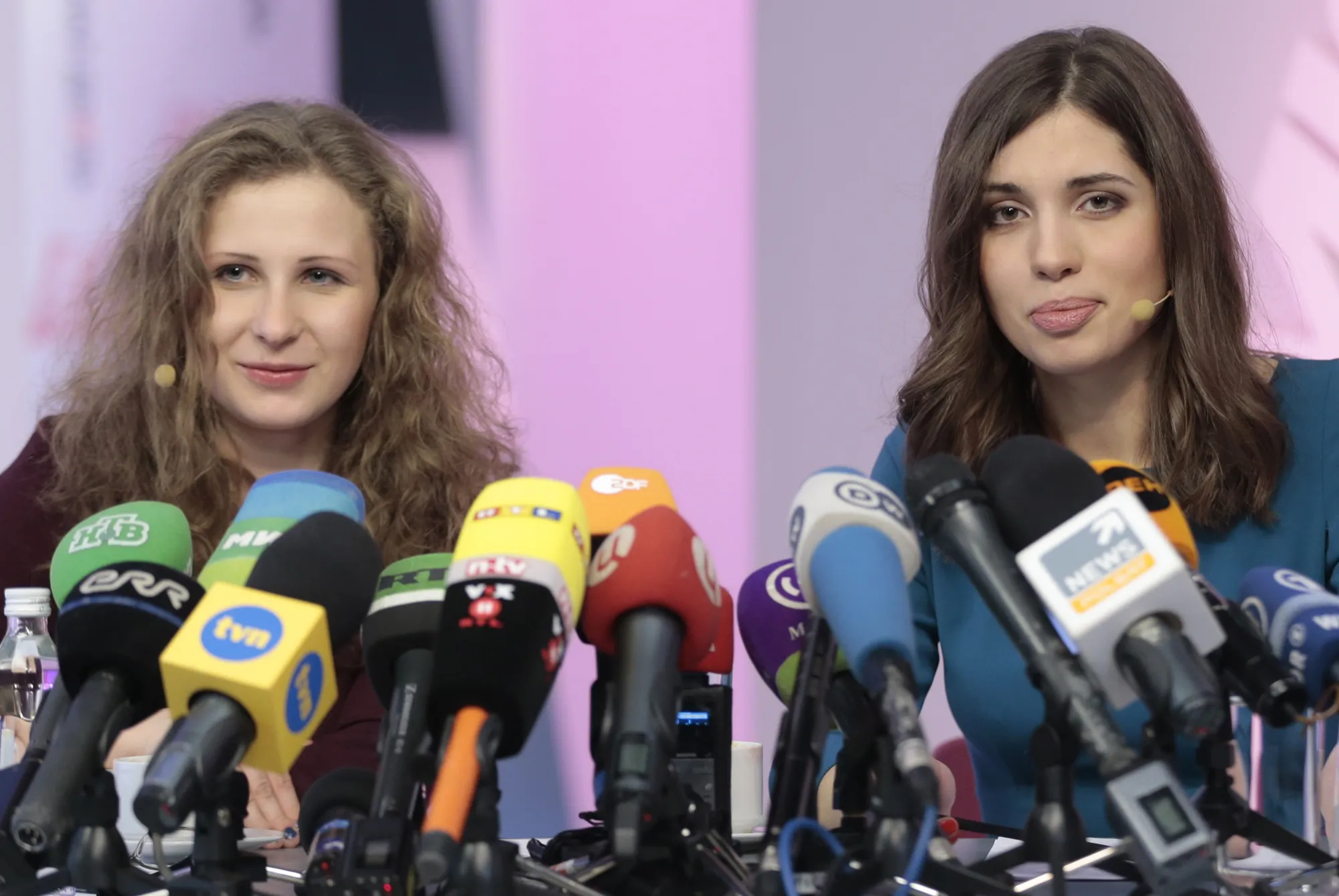 Russian punk band Pussy Riot members Nadezhda Tolokonnikova, right, and Maria Alekhina smile during their news conference in Moscow, Russia, on Friday, December 27, 2013. Tolokonnikova and Alekhina were granted amnesty on Monday, December 23, two months short of their scheduled release after spending nearly two years in prison for their protest at Moscow's main cathedral. (Photo by Ivan Sekretarev/AP Photo)