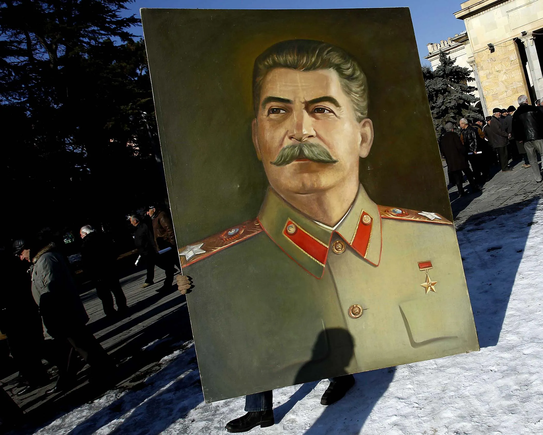 A man carries a portrait of Soviet dictator Josef Stalin as people attend a gathering marking the 130th anniversary of his birthday in Stalin's hometown of Gori, some 50 miles west of Tbilisi, Georgia, on December 21, 2013. (Photo by David Mdzinarishvili/Reuters)
