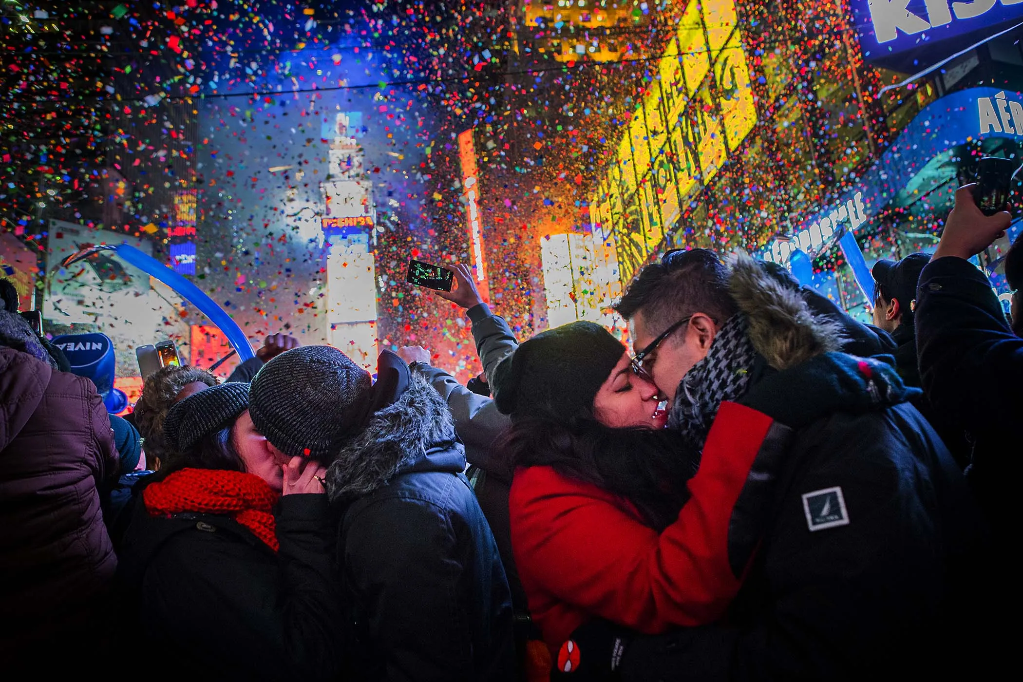 Couples kiss after midnight in Times Square. (Photo by Christopher Gregory/Getty Images)