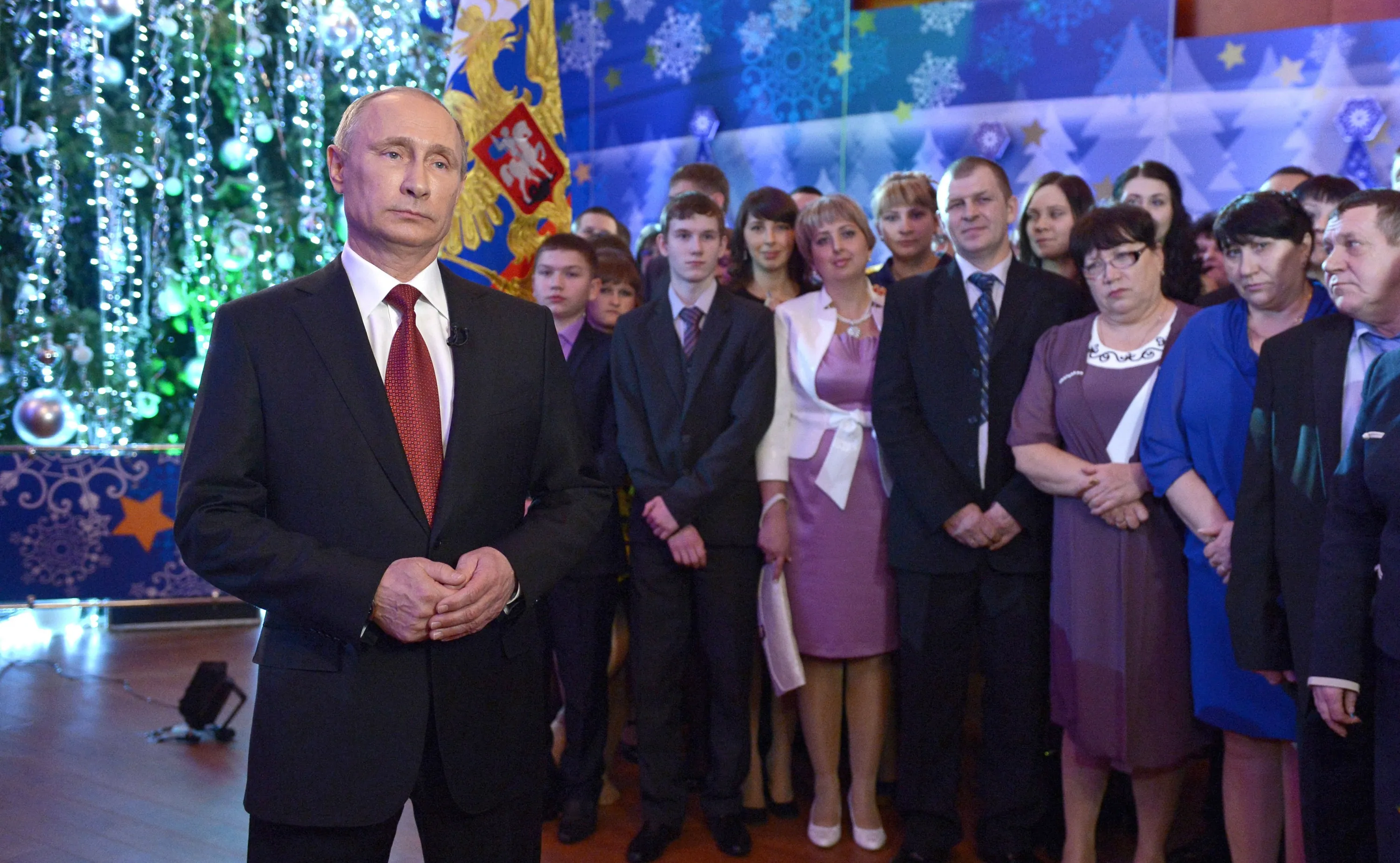 Russian President Vladimir Putin, left, and guests wait during a recording of his annual televised New Year's message to the nation during a New Year dinner celebration in Khabarovsk, Russia's Far East, Tuesday, December 31, 2013. (Photo by Alexei Nikolsky/AP Photo/RIA-Novosti/Presidential Press Service)