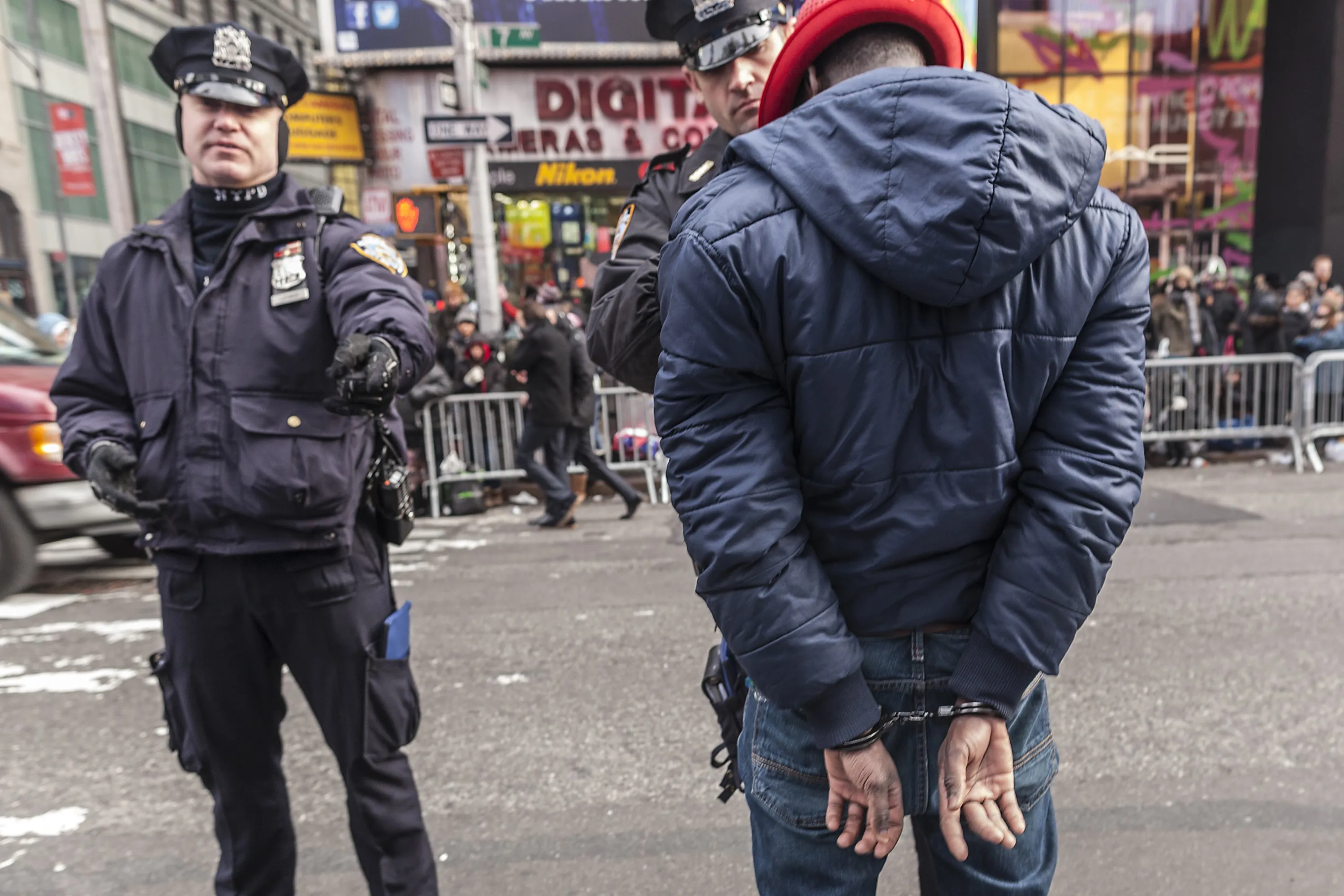 A man is hand-cuffed by the New York Police Department before New Year's Eve celebrations in Times Square in New York, December 31, 2013. (Photo by Zoran Milich/Reuters)
