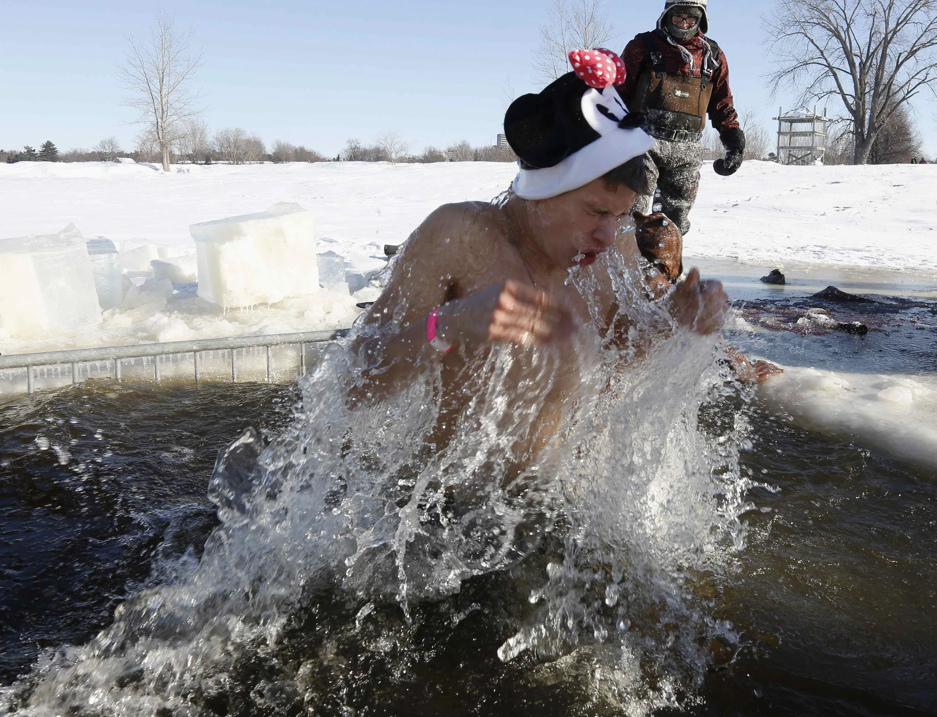A participant reacts after jumping into a hole cut in the ice on the Ottawa River during the annual Great Canadian Chill polar bear dip in Ottawa January 1, 2014. (Photo by Chris Wattie/Reuters)