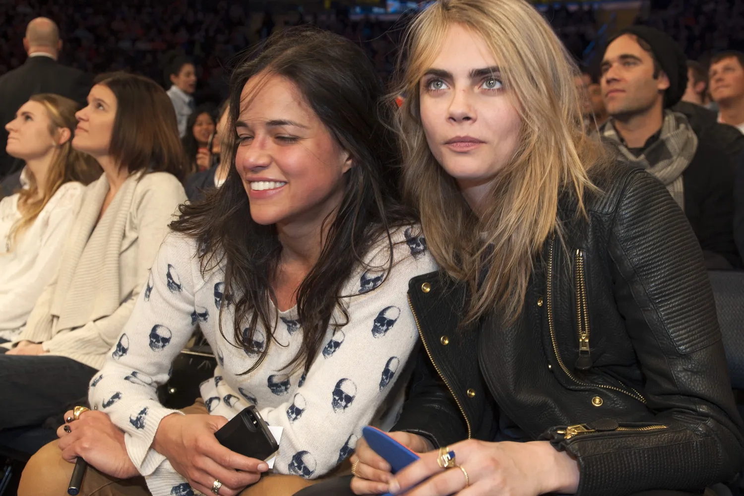 New York Knicks vs Detroit Pistons at Madison Square Garden: Actress Michelle Rodriguez and fashion model Cara Delevingne attend tonights game together seated in the front row. Michelle Rodriguez is visibly seen smoking what appears to be a E-Cigerette. As the game progressed Rodriguez appeared more and more intoxicated. January 7th, 2014. Credit Anthony J. Causi