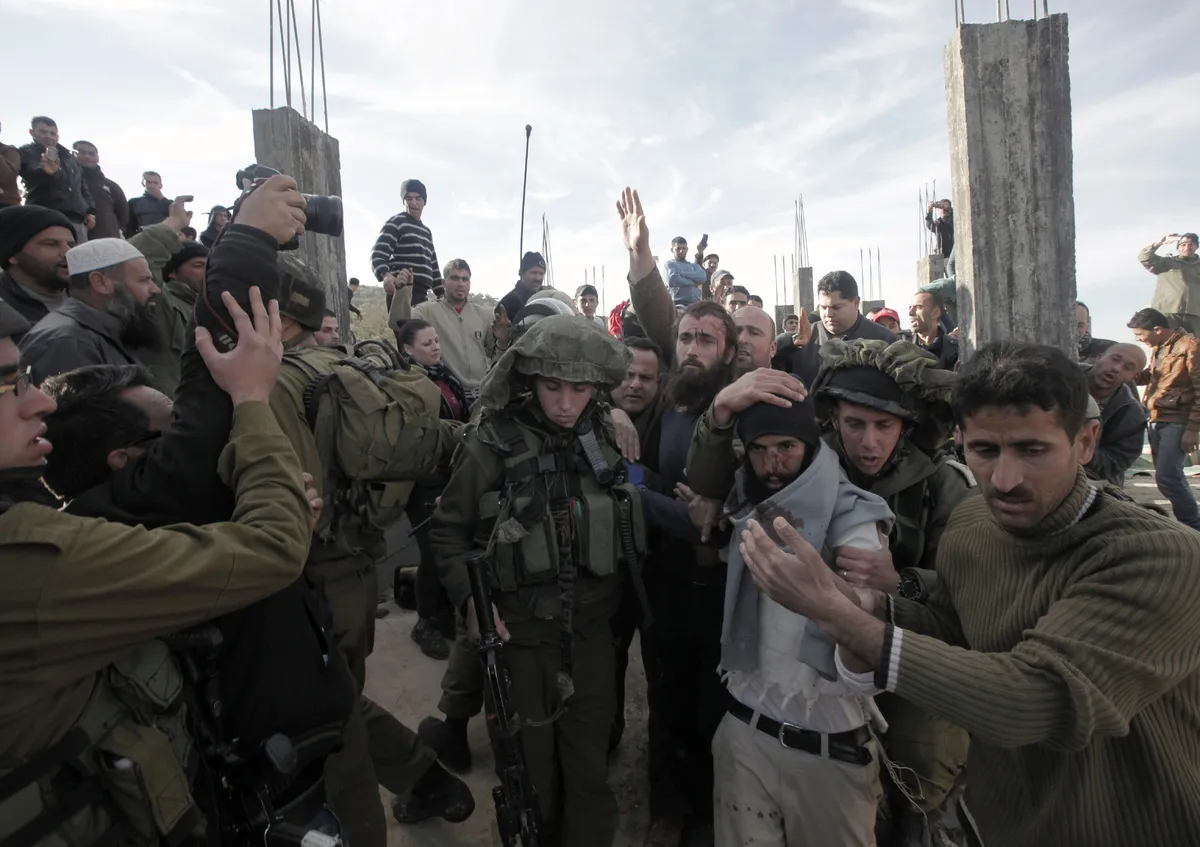 A Palestinian man (R) helps Israeli soldiers to evacuate Israeli settlers after they were detained and beaten by Palestinians from the village of Qusra on January 7, 2014. (Photo by Jaafar Ashtiyeh/AFP Photo)