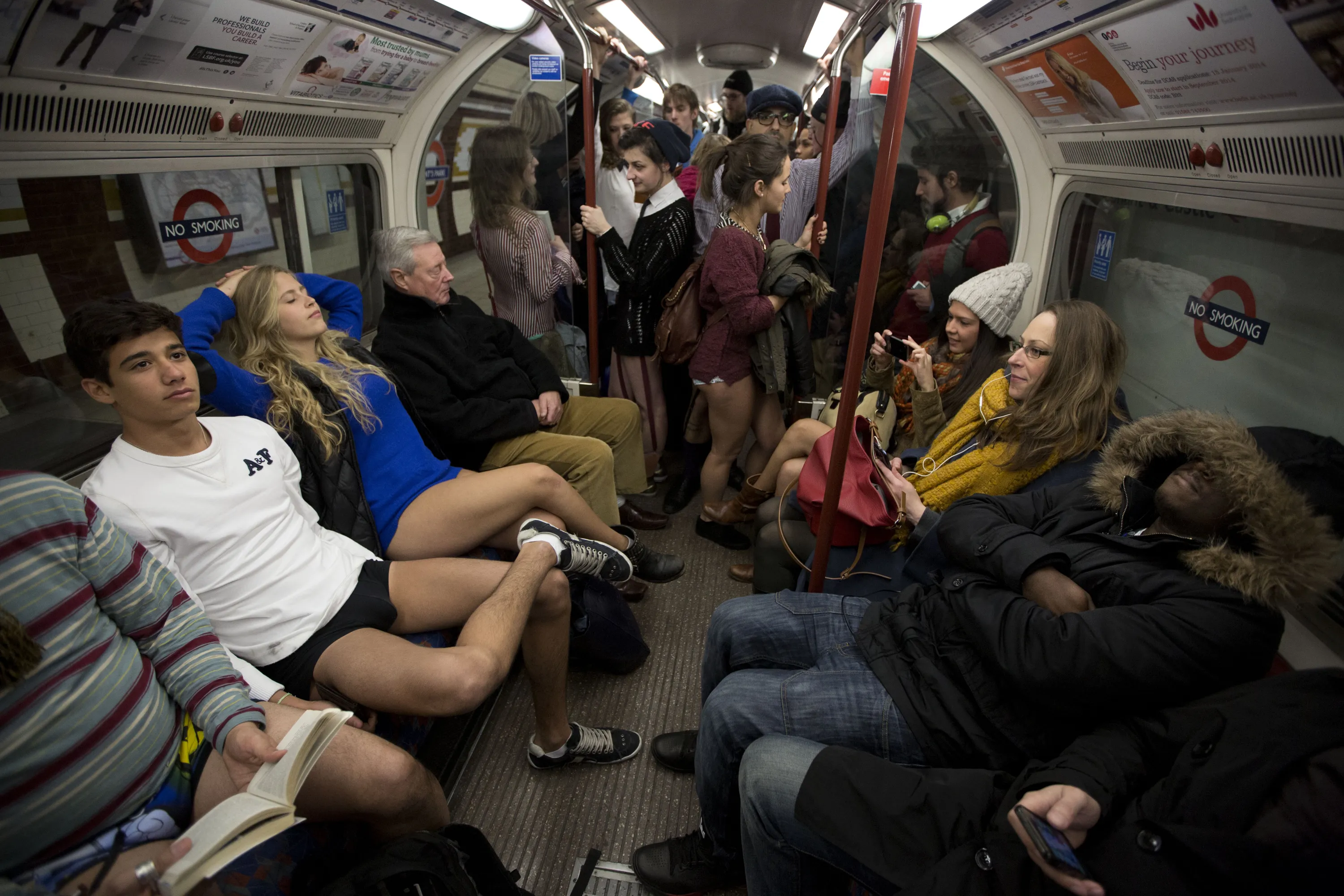 People take part in the “No Trousers Tube Ride” event next to other passengers on an underground train in London, Sunday, January 12, 2014. The stunt was held to coincide with the “Global No Pants Subway Ride”, where passengers board subway cars in the middle of winter without wearing trousers and act normally. (Photo by Matt Dunham/AP Photo)