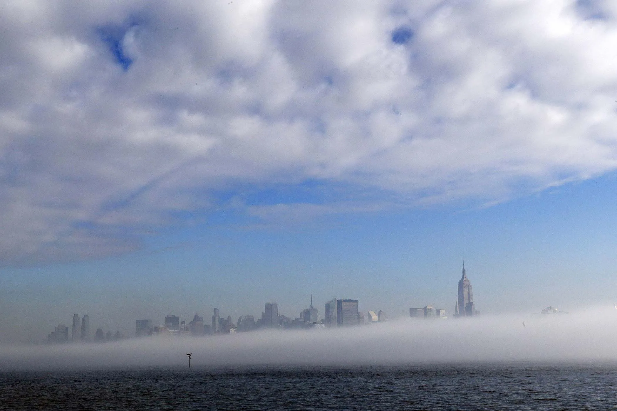 Parts of the New York City skyline peek through thick fog in this view from Pier A Park in Hoboken, N.J. (Photo by Julio Cortez/Associated Press)