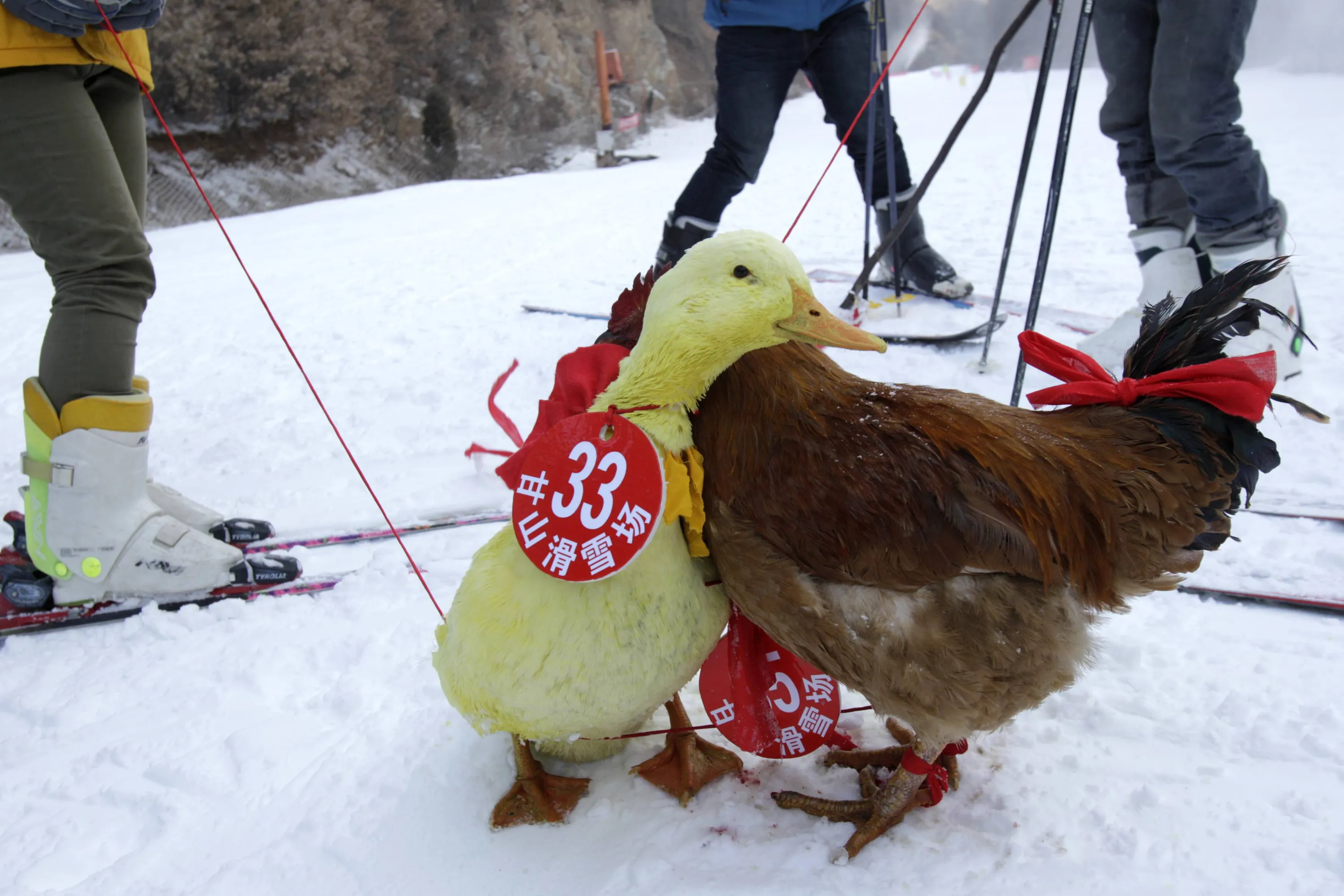 This picture taken on January 12, 2014 shows a duck and a chicken competing in a skiing competition held for pets and their owners in Sanmenxia, north China's Henan province. (Photo by AFP Photo)