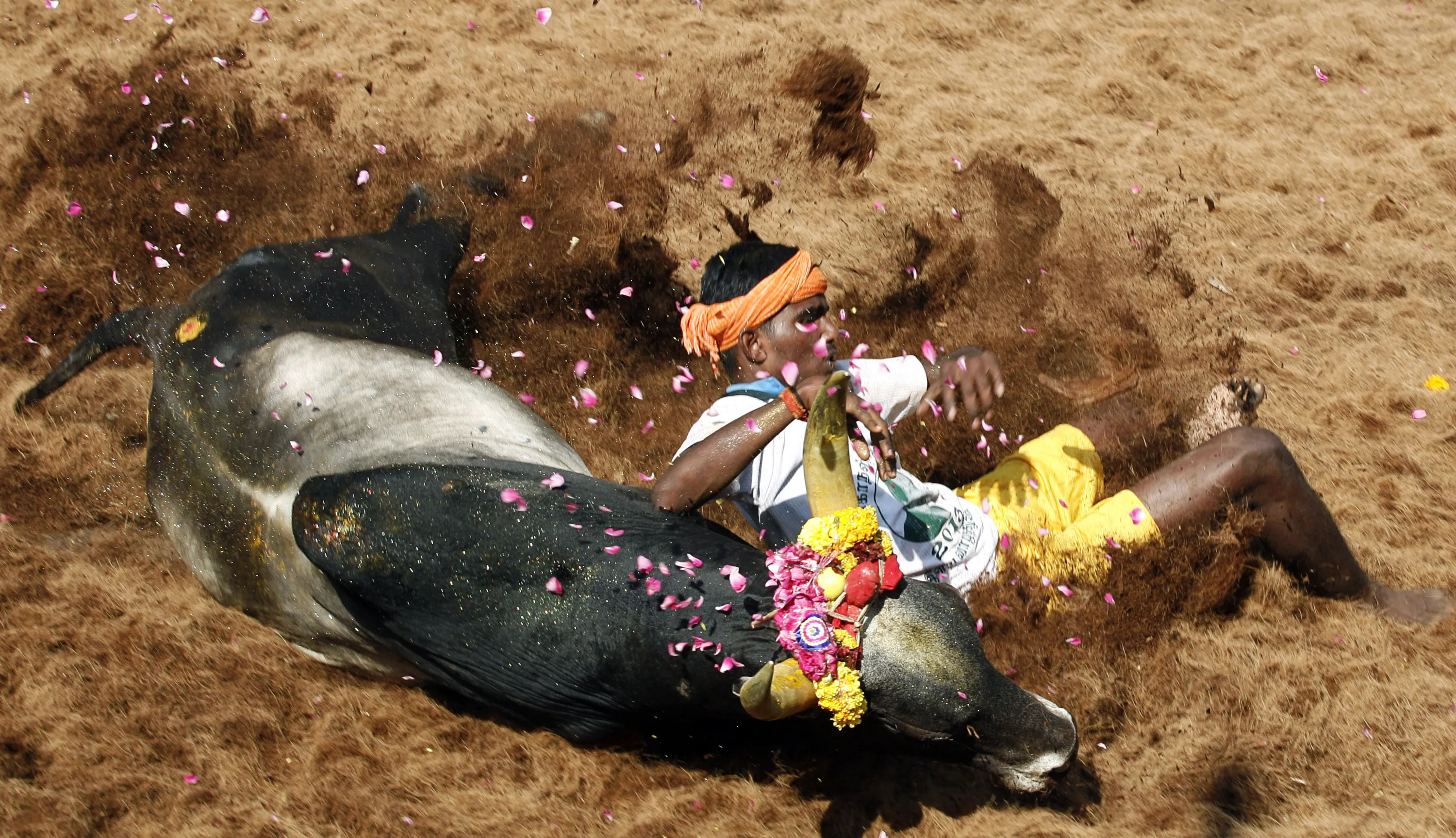 A bull tamer falls while trying to control a bull during the bull-taming sport called Jallikattu, in Alanganallur, about 530 kilometers (331 miles) south of Chennai, India, Wednesday, Jan. 16, 2013. (Photo by Arun Sankar K./AP Photo)