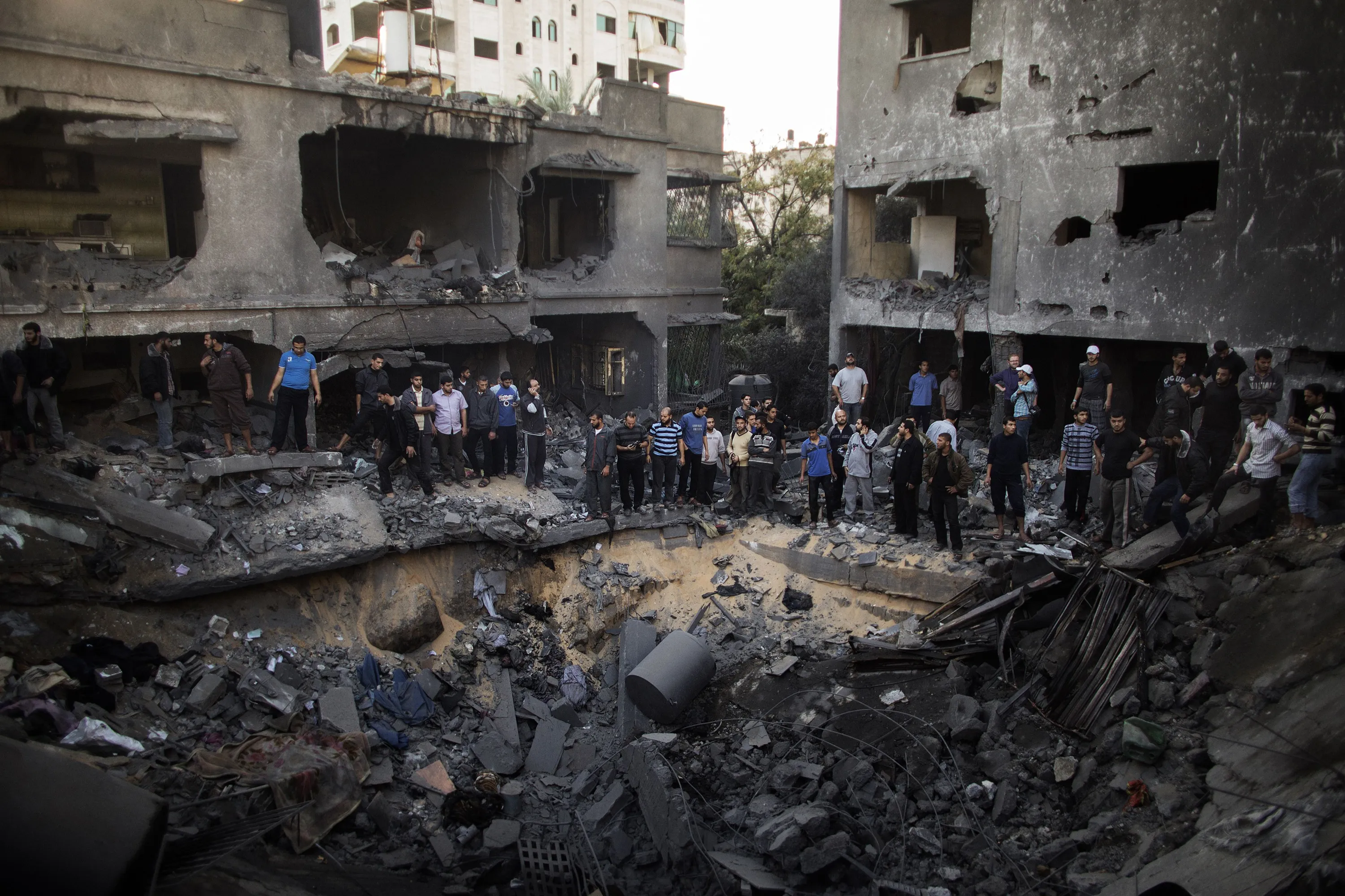 Palestinian men gather around a crater caused by an Israeli air strike on the al-Dallu family's home in Gaza City on November 18, 2012. (Photo by Marco Longari/AFP Photo)