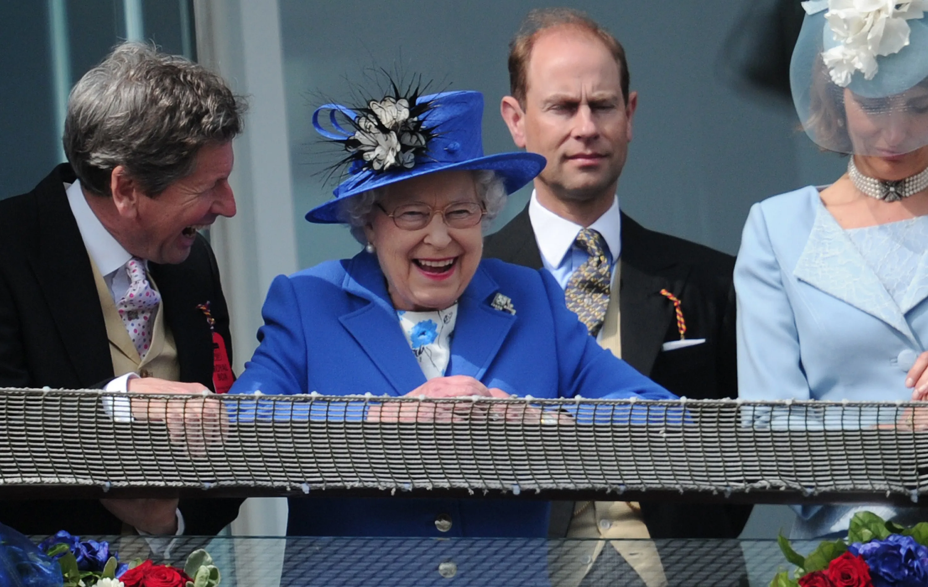 Britain's Queen Elizabeth II (C) standing next to Prince Edward, Earl of Wessex (2R) smiles from the royal balcony as she looks down on the winning horse in the Derby race on Derby Day, the second day of the Epsom Derby horse racing festival, at Epsom in Surrey, southern England, on June 2, 2012 the first official day of Britain's Queen Elizabeth II's Diamond Jubilee celebrations. (Photo by Carl Court/AFP Photo)