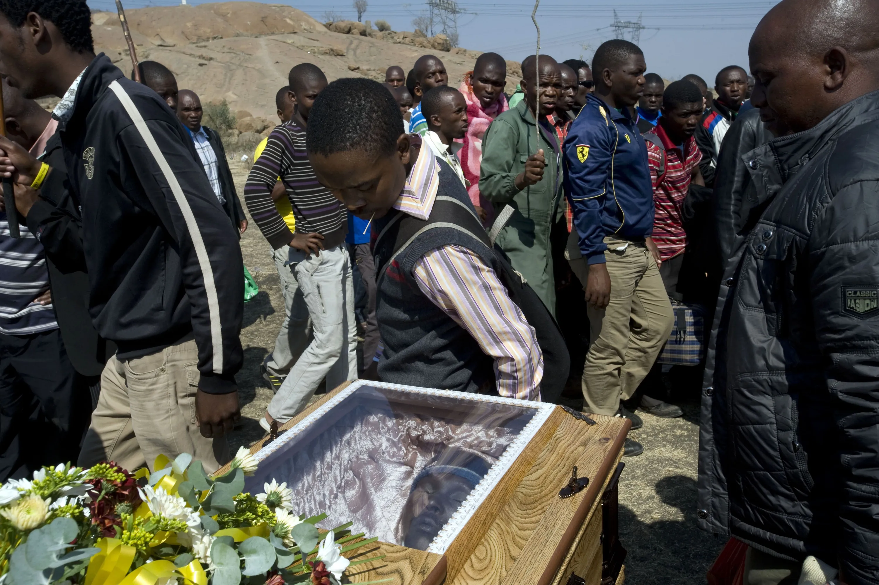 Lonmin mineworkers pay their respects on August 31, 2012 at the coffin containing the body of Mpuzeni Ngxande, one of the 34 striking miners that were killed by police on August 16, in front of the rocky outcrop where the men were shot, an informal settlement near the Lonmin mine in Marikana, North-West Province. (Photo by Rodger Bosch/AFP Photo)