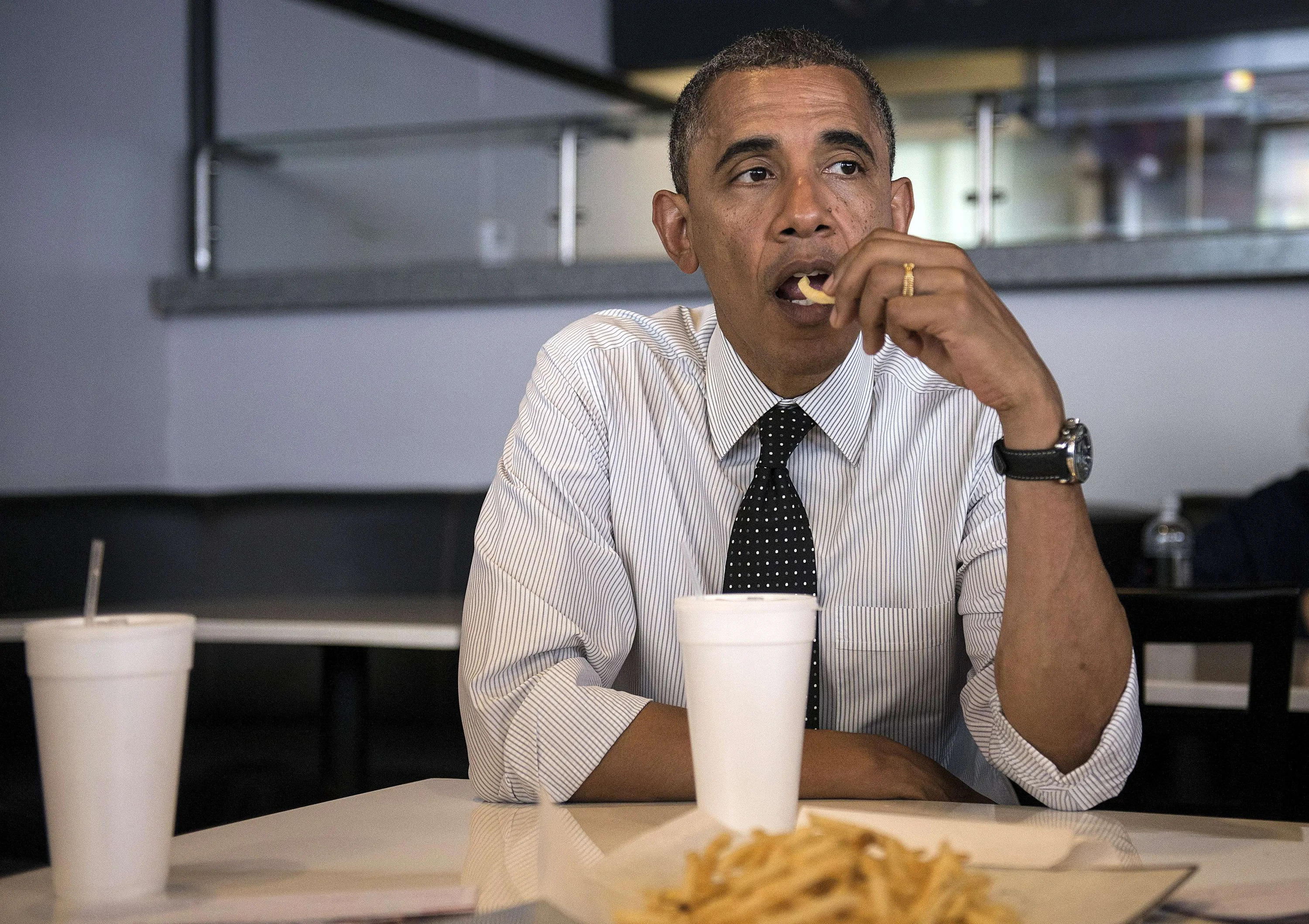 US President Barack Obama eats a french fry while meeting with supporters about voter registration at OMG Burgers on September 20, 2012 in Miami, Florida. (Photo by Brendan Smialowski/AFP Photo)