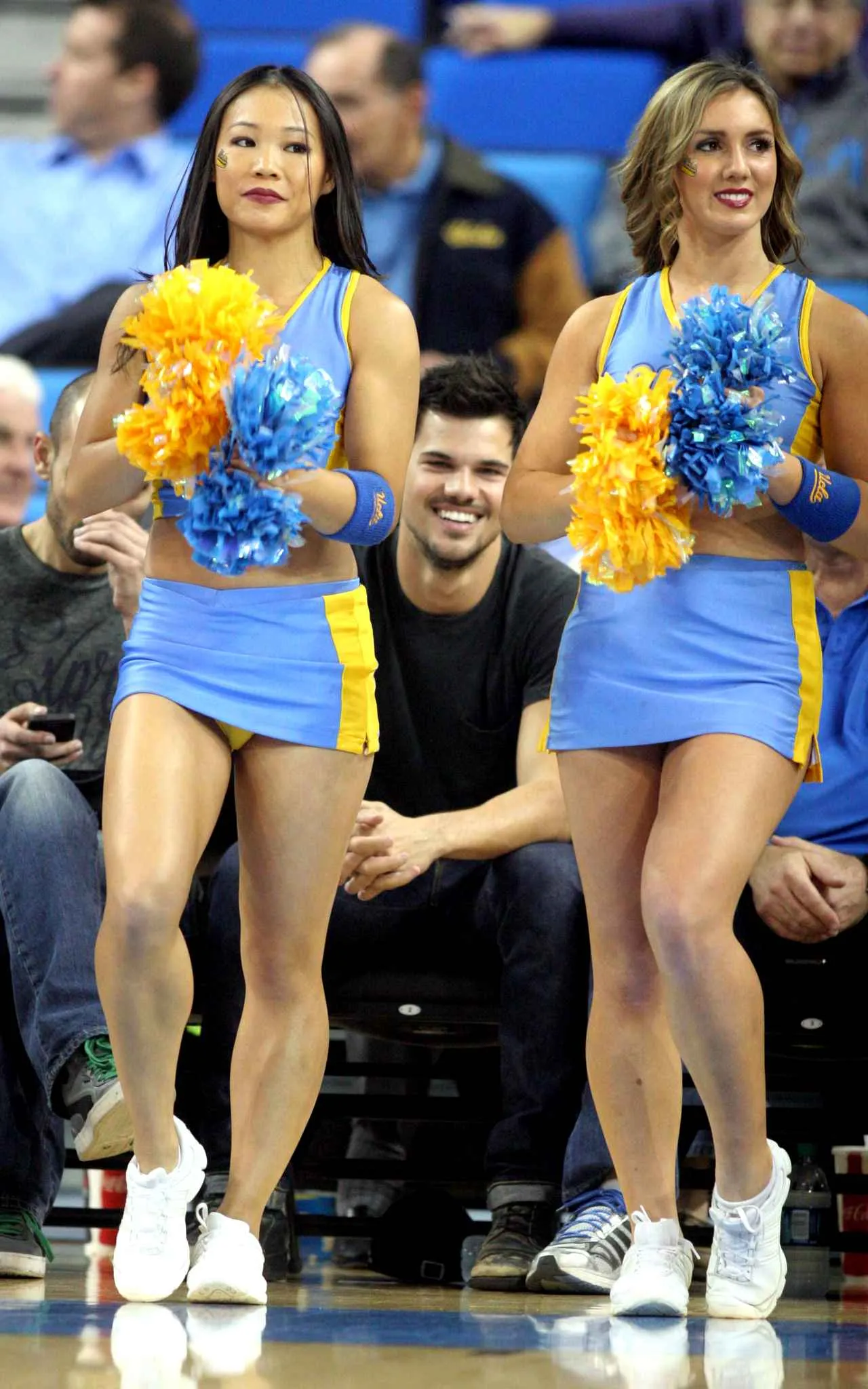 Taylor Lautner sits court side at the UCLA vs. Stanford basketball game with a few pals on Thursday evening in Los Angeles, on January 24, 2014. (Photo by WENN/SIPA Press)