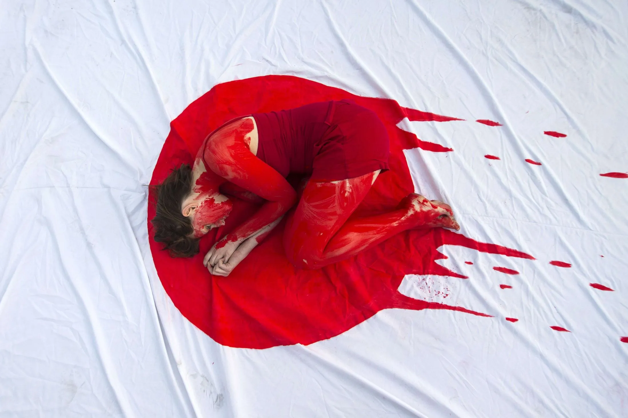 An Israeli member of the “Taiji Dolphin Action Group”, with a red body painting to evok blood, is curled up on a sheet depicting the Japanese flag, during a protest against the killing of dolphins, notably in the Japanese city of Taiji on January 30, 2014 outside the building housing the Japanese Embassy, in the Mediterranean coastal city of Tel Aviv. Similar rallies outside Japanese consulates and embassies were expected to take place worldwide. (Photo by Jack Guez/AFP Photo)