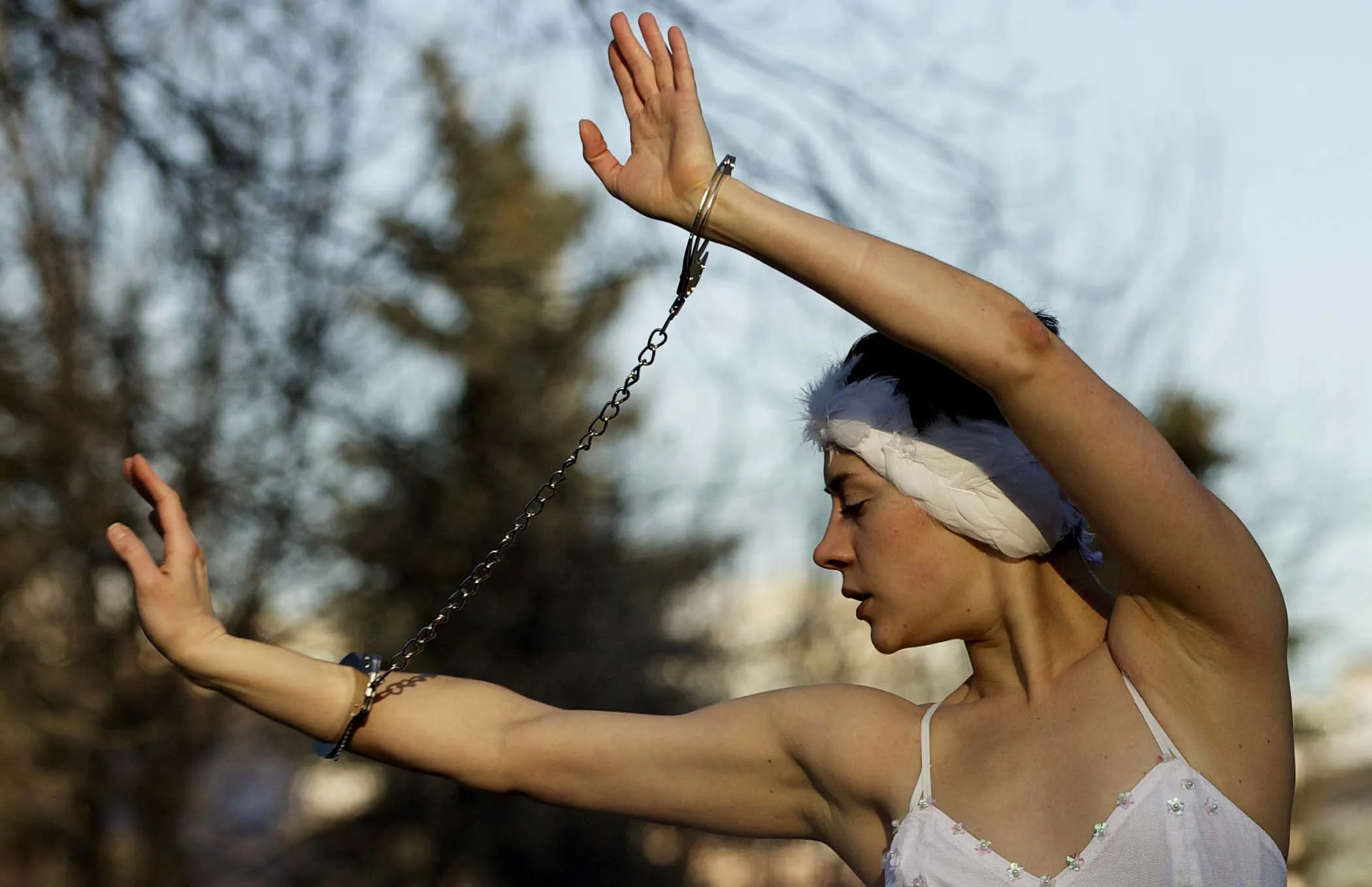 Ballet dancer Alexandra Portyannikova, with handcuffs on both hands and braving the frost of minus –4 °F (–20 °C), dances in a protest action in Moscow, on January 30, 2014. The protest action was organized by Amnesty International to draw the international community's attention to human rights violations in Russia. (Photo by Ivan Sekretarev/Associated Press)