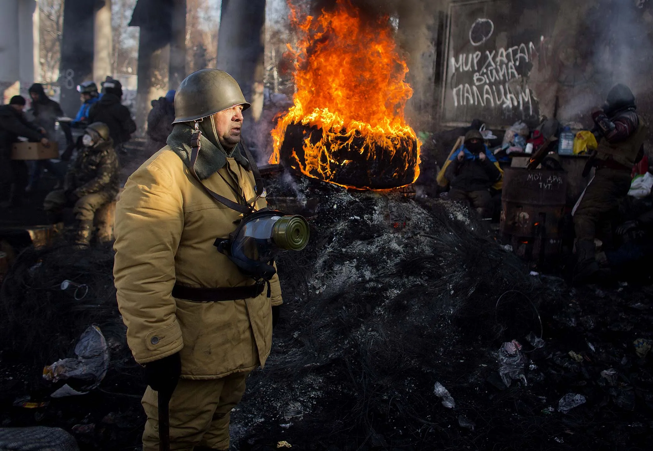 An opposition supporter stands next to a burning tire at a barricade in Kiev, on January 30, 2014. Ukraine's embattled president is taking sick leave, his office announced Thursday, a surprise development that left unclear how efforts to resolve the country's political crisis would move forward. Protesters have been calling for his resignation for two months. The sign at right reads: “Peace to the Villages, War to the Palaces”. (Photo by Darko Bandic/Associated Press)